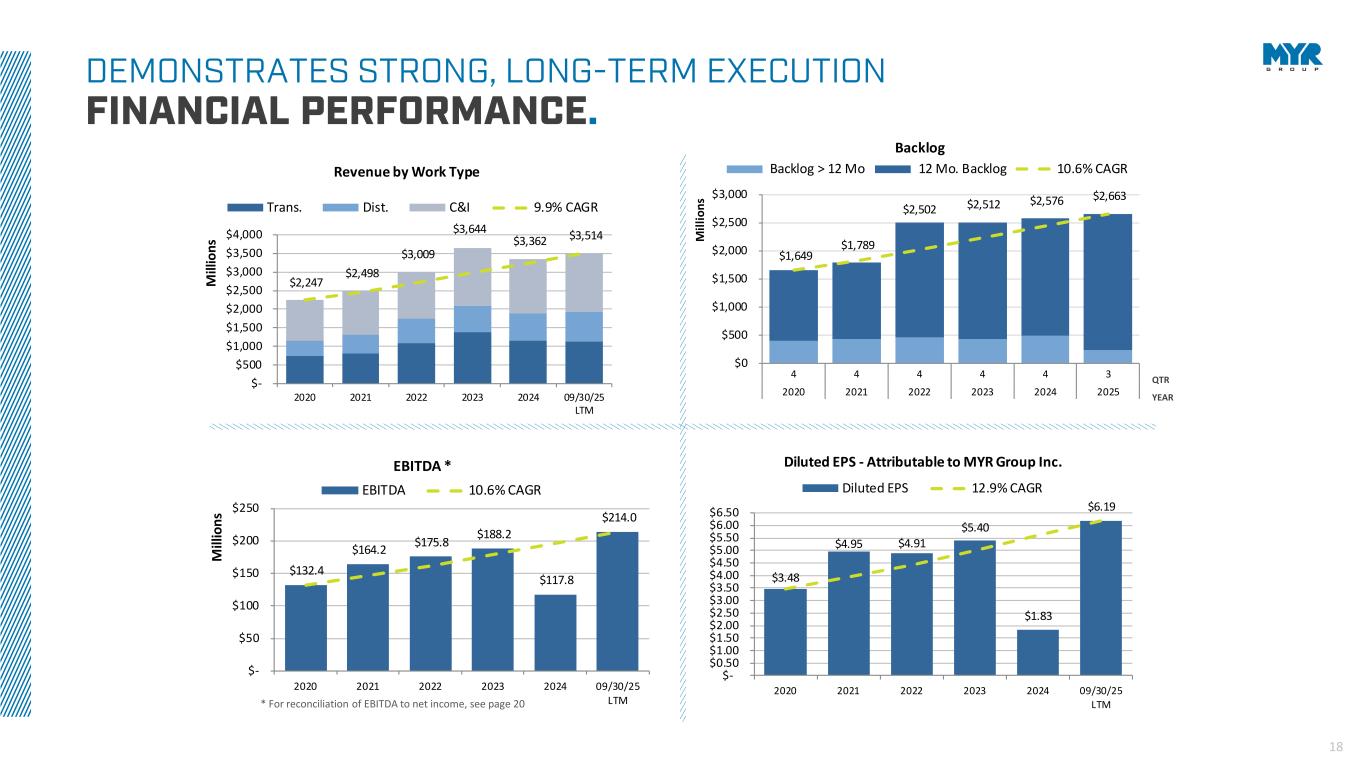 17 46.8% 15.3% 13.0% 11.8% 7.9% 0.0% 5.0% 10.0% 15.0% 20.0% 25.0% 30.0% 35.0% 40.0% 45.0% 50.0% EME DY MYRG PWR MTZ 3-Year Average ROIC WELL-POSITIONED TO SUPPORT ADDITIONAL GROWTH BALANCE SHEET STRENGTH. MYR, PWR, MTZ, and EME 3-year period is September 2022 – September 2025 DY 3-year period is July 2022 – July 2025 • Low debt leverage • Strong balance sheet with $400M in availability under our $490M credit facility • Substantial bonding capacity • Investment in specialty equipment supports future organic growth $44.4 $52.4 $77.1 $84.7 $75.9 $76.8 0.0% 2.0% 4.0% 6.0% 8.0% 10.0% $0 $20 $40 $60 $80 $100 2020 2021 2022 2023 2024 09/30/25 LTM M ill io n s CAPEX Investment CAPEX Spend CAPEX % of Rev $(150) $(100) $(50) $- $50 $100 $150 $200 $250 $300 $350 $400 $450 $500 $550 $600 $650 2020 2021 2022 2023 2024 09/30/25 M ill io n s Liquidity Credit Facility Cash LOC Bank Debt Total Liquidity