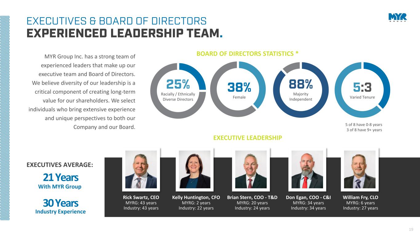 18 $132.4 $164.2 $175.8 $188.2 $117.8 $214.0 $- $50 $100 $150 $200 $250 2020 2021 2022 2023 2024 09/30/25 LTM M ill io n s EBITDA * EBITDA 10.6% CAGR DEMONSTRATES STRONG, LONG-TERM EXECUTION FINANCIAL PERFORMANCE. * For reconciliation of EBITDA to net income, see page 20 QTR YEAR $2,247 $2,498 $3,009 $3,644 $3,362 $3,514 $- $500 $1,000 $1,500 $2,000 $2,500 $3,000 $3,500 $4,000 2020 2021 2022 2023 2024 09/30/25 LTM M ill io n s Revenue by Work Type Trans. Dist. C&I 9.9% CAGR $1,649 $1,789 $2,502 $2,512 $2,576 $2,663 $0 $500 $1,000 $1,500 $2,000 $2,500 $3,000 4 4 4 4 4 3 2020 2021 2022 2023 2024 2025 M il li o n s Backlog Backlog > 12 Mo 12 Mo. Backlog 10.6% CAGR $3.48 $4.95 $4.91 $5.40 $1.83 $6.19 $- $0.50 $1.00 $1.50 $2.00 $2.50 $3.00 $3.50 $4.00 $4.50 $5.00 $5.50 $6.00 $6.50 2020 2021 2022 2023 2024 09/30/25 LTM Diluted EPS - Attributable to MYR Group Inc. Diluted EPS 12.9% CAGR
