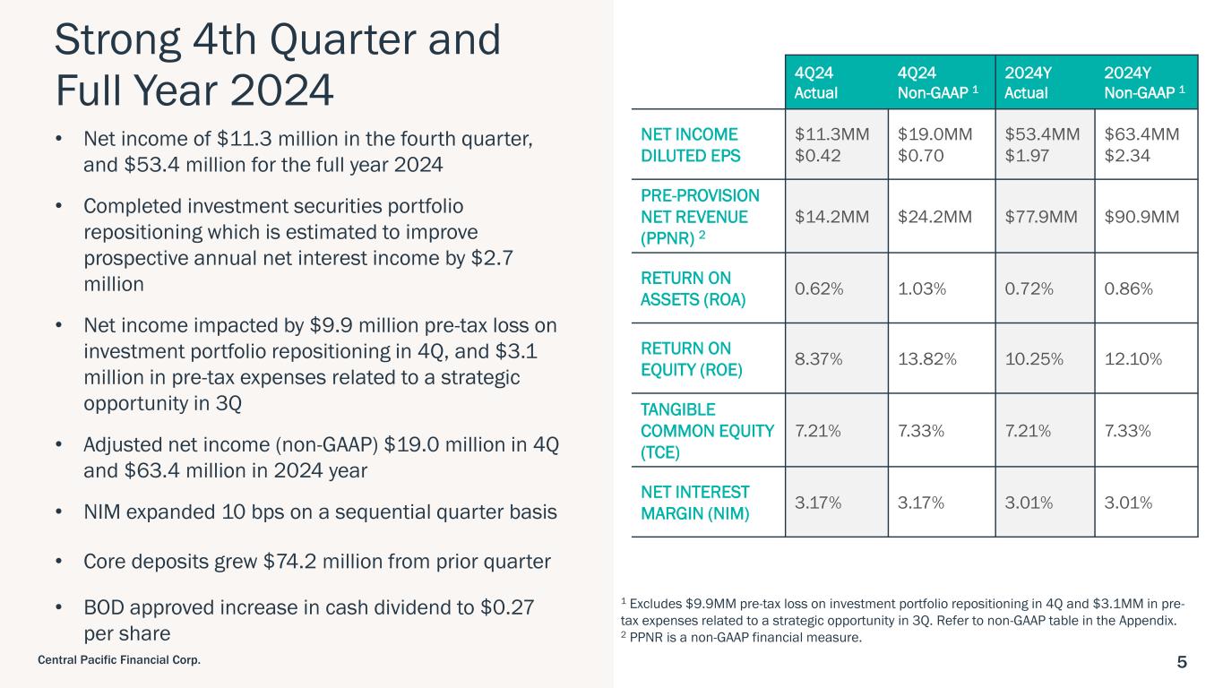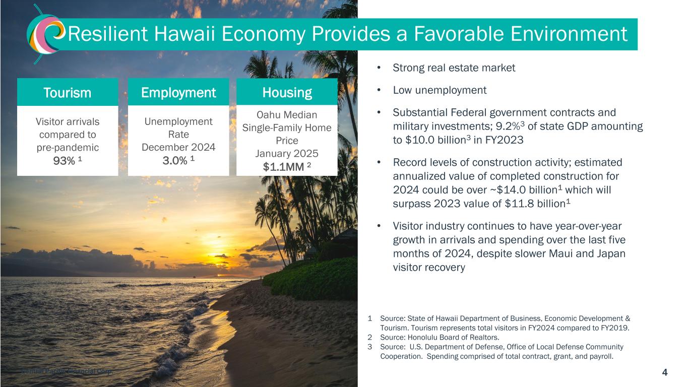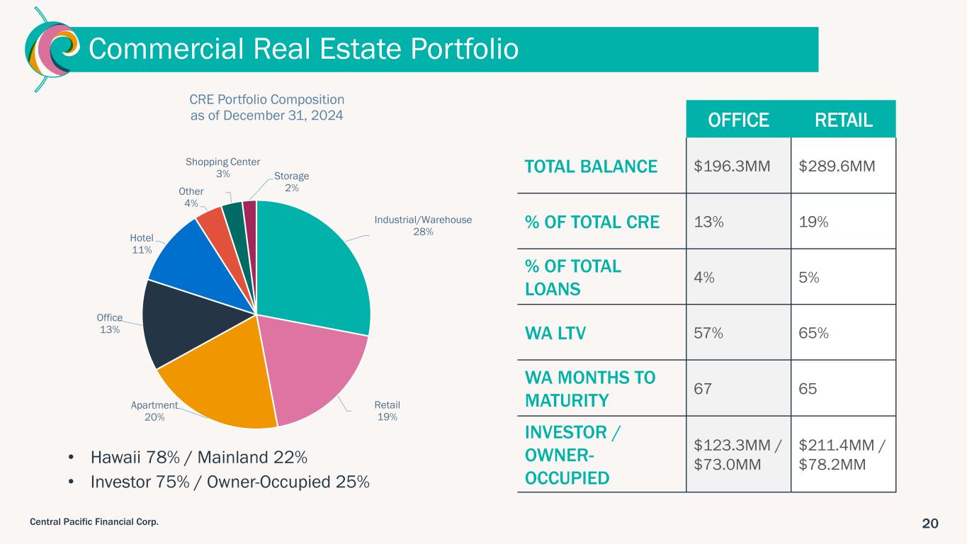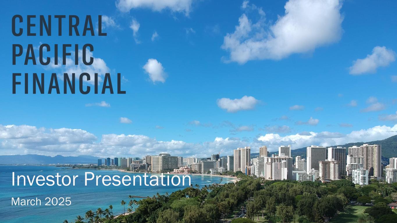 2Central Pacific Financial Corp. Forward-Looking Statements This document and the accompanying oral presentation may contain forward-looking statements (“FLS”) concerning: projections of revenues, expenses, income or loss, earnings or loss per share, capital expenditures, the payment or nonpayment of dividends, net interest income, capital position, credit losses, net interest margin or other financial items; statements of plans, objectives and expectations of Central Pacific Financial Corp. (the "Company") or its management or Board of Directors, including those relating to business plans, use of capital resources, products or services and regulatory developments and regulatory actions; statements of future economic performance including anticipated performance results from our business initiatives; or any statements of the assumptions underlying or relating to any of the foregoing. Words such as "believe," "plan," "anticipate," "seek," "expect," "intend," "forecast," "hope," "target," "continue," "remain," "estimate," "will," "should," "may" and other similar expressions are intended to identify FLS but are not the exclusive means of identifying such statements. While we believe that our FLS and the assumptions underlying them are reasonably based, such statements and assumptions are by their nature subject to risks and uncertainties, thus could later prove to be inaccurate or incorrect. Accordingly, actual results could differ materially from those statements or projections for a variety of reasons, including, but not limited to: the effects of inflation and interest rate fluctuations, including the impact from potential international tariff; disruptions in the economy, including supply chain disruptions; labor contract disputes and potential strikes impacting both the U.S. National and Hawaii economies; the increase in inventory or adverse conditions in the real estate market and deterioration in the construction industry; adverse changes in the financial performance and/or condition of our borrowers and, as a result, increased loan delinquency rates, deterioration in asset quality, and losses in our loan portfolio; the impact of local, national, and international economies and events (including natural disasters such as wildfires, volcanic eruptions, hurricanes, tsunamis, storms, and earthquakes) on the Company's business and operations and on tourism, the military, and other major industries operating within the Hawaii market and any other markets in which the Company does business; deterioration or malaise in domestic economic conditions, including any destabilization in the financial industry and deterioration of the real estate market, as well as the impact of declining levels of consumer and business confidence in the state of the economy in general and in financial institutions in particular; changes in estimates of future reserve requirements based upon the periodic review thereof under relevant regulatory and accounting requirements; the adverse effects of potential bank failures and the potential impact of such developments on customer confidence, deposit behavior, liquidity and regulatory responses thereto; the adverse effects of the COVID-19 pandemic virus (and its variants) and other pandemic viruses on local, national and international economies, including, but not limited to, the adverse impact on tourism and construction in the State of Hawaii, our borrowers, customers, third-party contractors, vendors and employees, as well as the effects of government programs and initiatives in response thereto; the impact of the Dodd-Frank Wall Street Reform and Consumer Protection Act, changes in capital standards, other regulatory reform and federal and state legislation, including but not limited to regulations promulgated by the Consumer Financial Protection Bureau, government-sponsored enterprise reform, and any related rules and regulations which affect our business operations and competitiveness; the costs and effects of legal and regulatory developments, including legal proceedings and lawsuits we are or may become subject to, or regulatory or other governmental inquiries and proceedings and the resolution thereof; the results of regulatory examinations or reviews and the effect of, and our ability to comply with, any regulations or regulatory orders or actions we are or may become subject to, and the effect of any recurring or special FDIC assessments; the impact of a potential new regulatory reform agenda by the Trump administration that is significantly different than that of the Biden administration, impacting the rulemaking, supervision, examination and enforcement priorities of the federal banking agencies; the effect of changes in accounting policies and practices, as may be adopted by the regulatory agencies, as well as the Public Company Accounting Oversight Board, the Financial Accounting Standards Board and other accounting standard setters and the cost and resources required to implement such changes; the effects of and changes in trade, monetary and fiscal policies and laws, including the interest rate policies of the Board of Governors of the Federal Reserve System; changes in the competitive environment among bank holding companies and other financial service providers; securities market and monetary fluctuations, including the impact resulting from the elimination of the London Interbank Offered Rate Index; negative trends in our market capitalization and adverse changes in the price of the Company's common stock; the effects of any acquisitions or dispositions we may make or evaluate, and the costs associated with any potential or actual acquisition or disposition; political instability; acts of war or terrorism; changes in consumer spending, borrowings and savings habits; technological changes and developments; cybersecurity and data privacy breaches and the consequence therefrom; susceptibility of fraud on the business; failure to maintain effective 