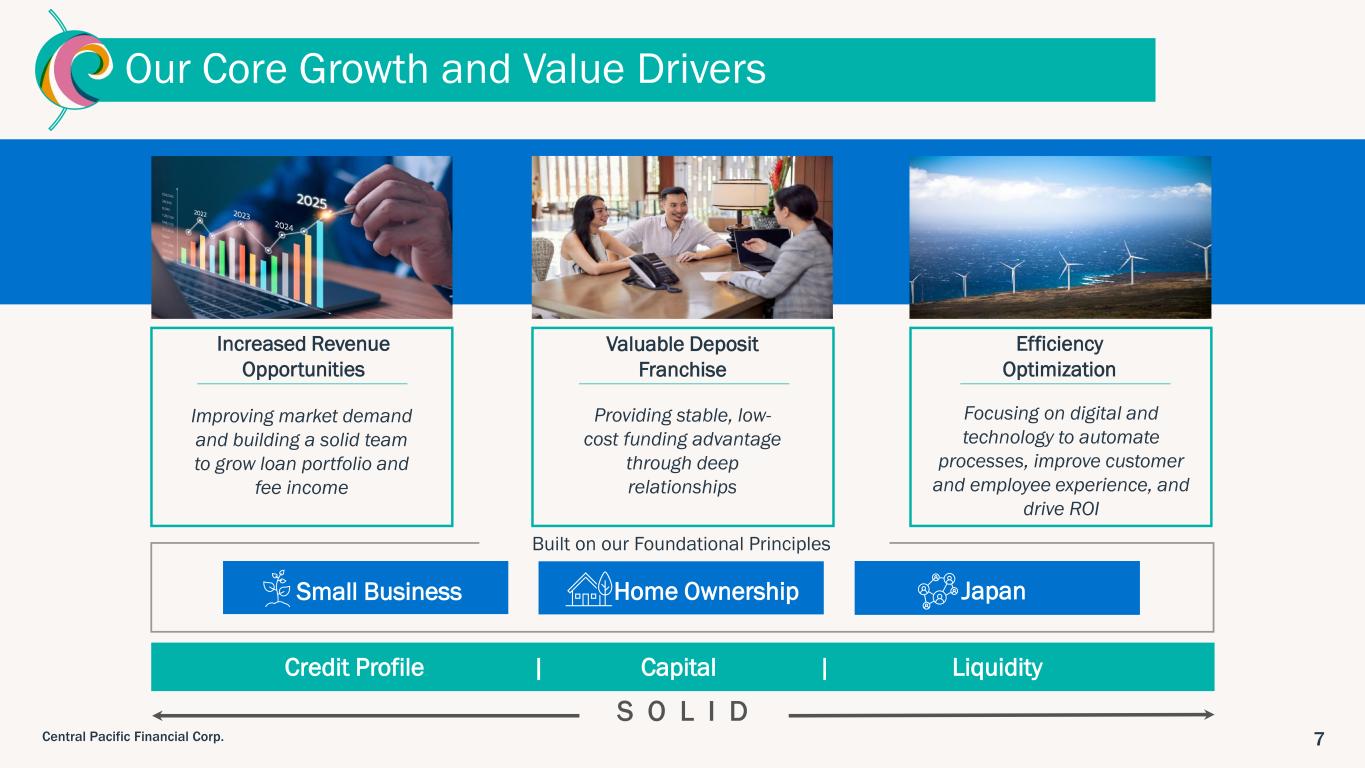 6Central Pacific Financial Corp. • Advocate for affordable housing in Hawaii • Accretive to construction loans, CRE take-out financing and residential loan business • Engaged in key joint ventures with mortgage brokers • Established key alliances with Hokuyo Bank and Tokyo Star Bank • Deep expertise and legacy of leadership connections • Produces deposit generating opportunities • SBA Lender of the Year Category II 16 times since 2004 • Launched our Business Express online loan portal to offer self- service credit application options 24/7 • Leads to loan and deposit growth opportunities HOME OWNERSHIP Go-to lender, driving Hawaii housing solutions SMALL BUSINESS #1 bank for small businesses in Hawaii JAPAN Bridging Hawaii and Japan Who We Are: Our Foundational Principles