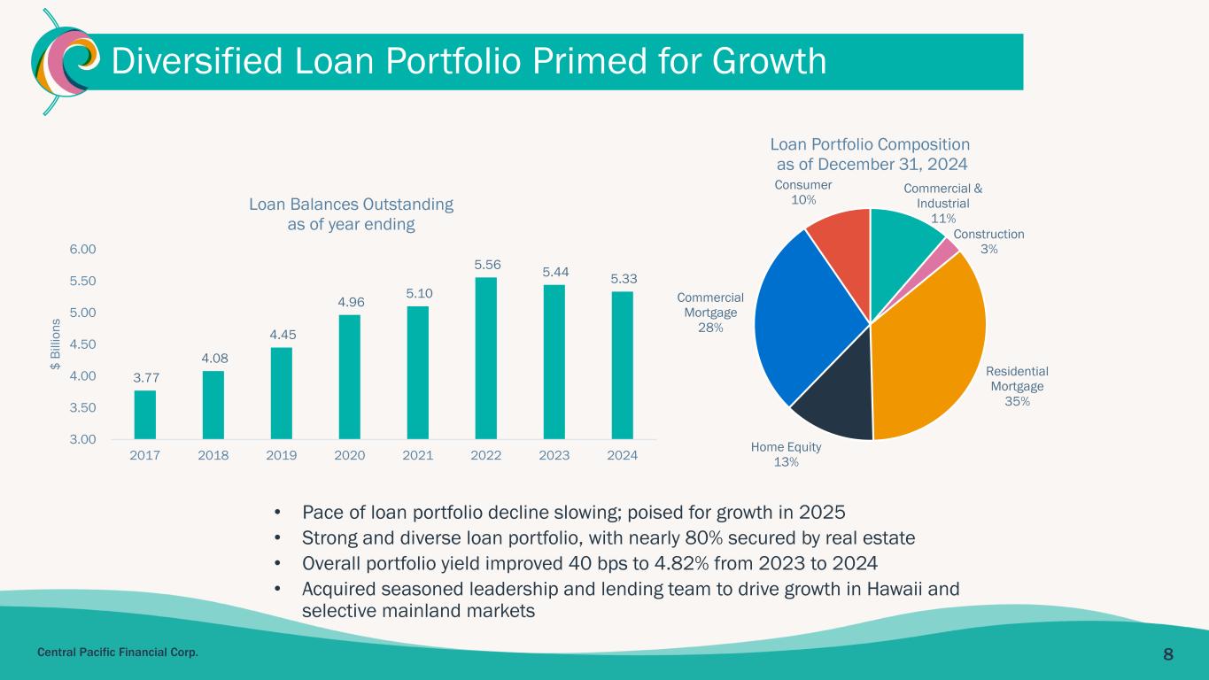 7Central Pacific Financial Corp. Efficiency Optimization Valuable Deposit Franchise Increased Revenue Opportunities Credit Profile | Capital | Liquidity Improving market demand and building a solid team to grow loan portfolio and fee income Providing stable, low- cost funding advantage through deep relationships Focusing on digital and technology to automate processes, improve customer and employee experience, and drive ROI Our Core Growth and Value Drivers S O L I D Small Business Home Ownership JapanJapan Built on our Foundational Principles