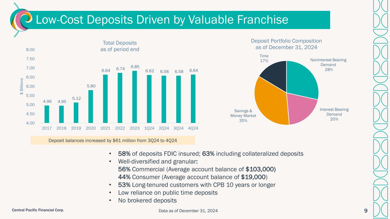8Central Pacific Financial Corp. Diversified Loan Portfolio Primed for Growth • Pace of loan portfolio decline slowing; poised for growth in 2025 • Strong and diverse loan portfolio, with nearly 80% secured by real estate • Overall portfolio yield improved 40 bps to 4.82% from 2023 to 2024 • Acquired seasoned leadership and lending team to drive growth in Hawaii and selective mainland markets 3.77 4.08 4.45 4.96 5.10 5.56 5.44 5.33 3.00 3.50 4.00 4.50 5.00 5.50 6.00 2017 2018 2019 2020 2021 2022 2023 2024 $ B il li o n s Loan Balances Outstanding as of year ending Commercial & Industrial 11% Construction 3% Residential Mortgage 35% Home Equity 13% Commercial Mortgage 28% Consumer 10% Loan Portfolio Composition as of December 31, 2024