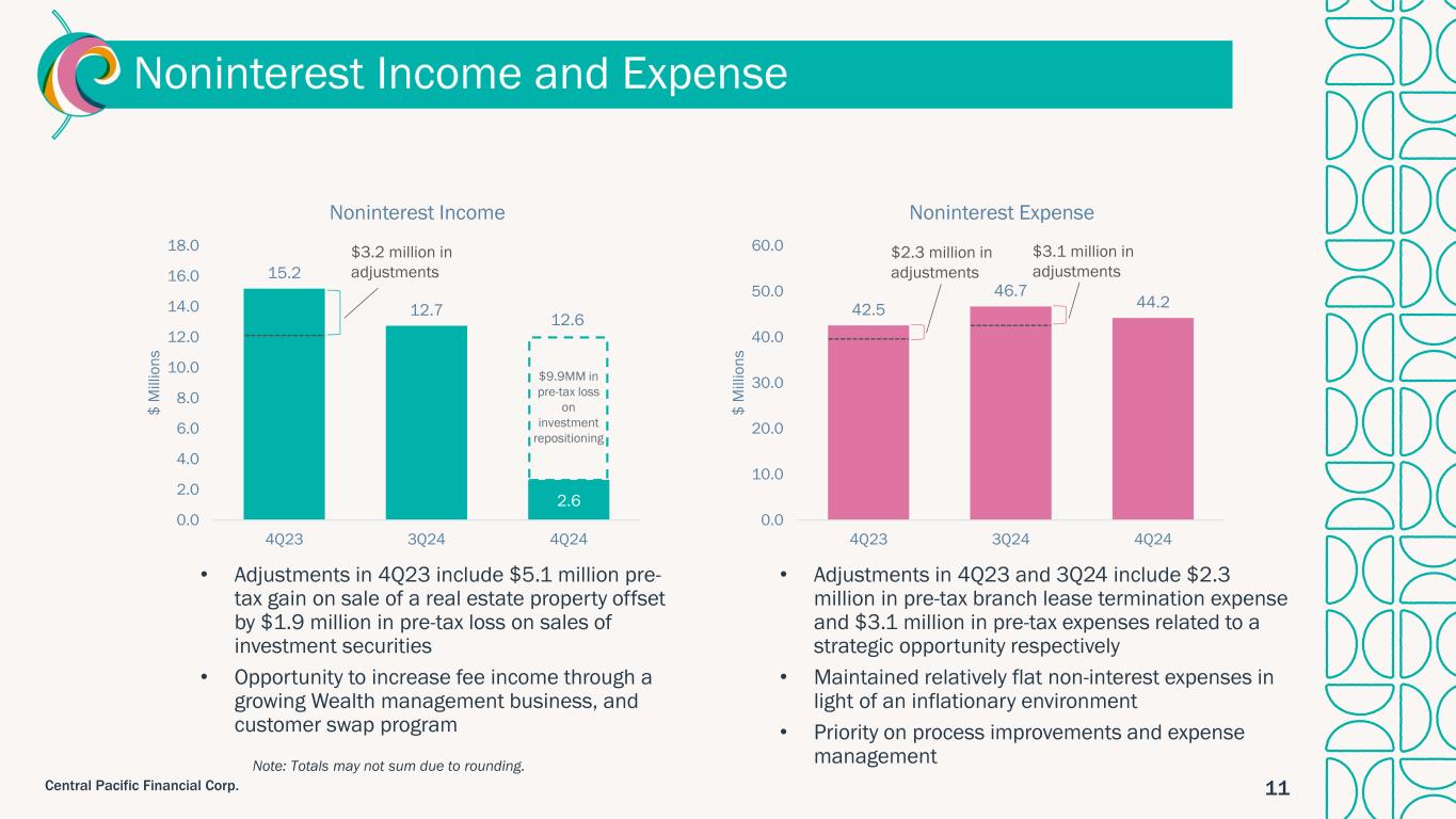 10Central Pacific Financial Corp. 1.21% 1.66% 2.31% 0.00% 0.50% 1.00% 1.50% 2.00% 2.50% 3.00% 2017 2018 2019 2020 2021 2022 2023 1Q24 2Q24 3Q24 4Q24 Total Deposit Cost CPF HI Peers Nat'l Peers • Source: CPF Form 10-K for the fiscal year ended 12/31/2024, S&P Global • HI Peers includes BOH and FHB • Nat’l Peers includes publicly traded banks with total assets of $3-10 billion as of 12/31/24 Low rate-sensitive, relationship-based deposit portfolio provides significant cost advantage CPF total deposit cost declined 11 bps to 1.21% from 3Q24 to 4Q24 CPF Deposit Cost Advantage 28.4% 30.3% 23.4% CPF HI Peers Nat'l Peers Non-Interest Bearing Deposits to Total Deposits as of December 31, 2024 2.84% 3.07% 3.17% 2.48% 2.57% 2.62% 3.27% 3.31% 3.37% 4Q23 3Q24 4Q24 Net Interest Margin CPF HI Peers Nat'l Peers