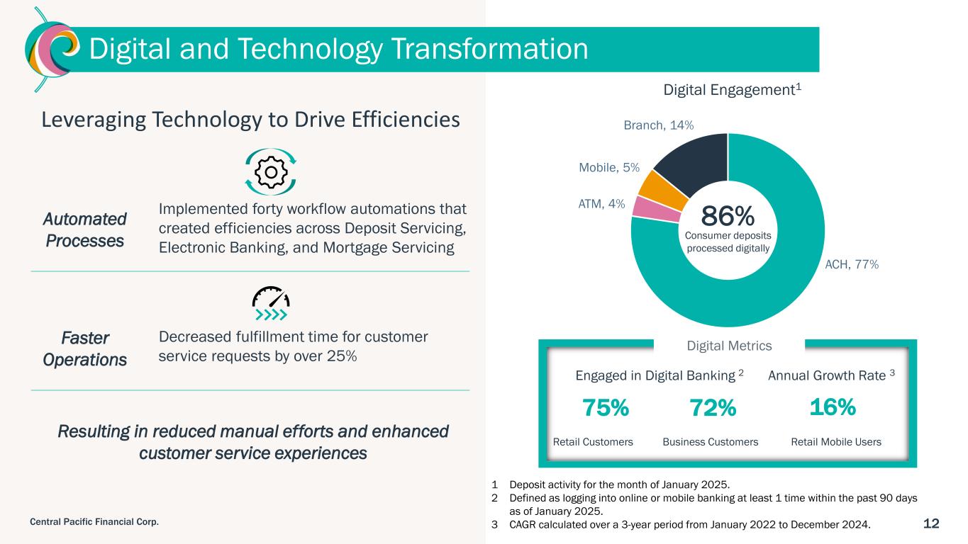121Central Pacific Financial Corp. Digital and Technology Transformation ACH, 77% ATM, 4% Mobile, 5% Branch, 14% 86% Consumer deposits processed digitally Digital Engagement1 Digital Metrics 1 Deposit activity for the month of January 2025. 2 Defined as logging into online or mobile banking at least 1 time within the past 90 days as of January 2025. 3 CAGR calculated over a 3-year period from January 2022 to December 2024. Engaged in Digital Banking 2 75% 72% Retail Customers Business Customers 75% 72% Retail Mobile Users 16% Annual Growth Rate 3 Resulting in reduced manual efforts and enhanced customer service experiences Leveraging Technology to Drive Efficiencies Automated Processes Implemented forty workflow automations that created efficiencies across Deposit Servicing, Electronic Banking, and Mortgage Servicing Faster Operations Decreased fulfillment time for customer service requests by over 25%