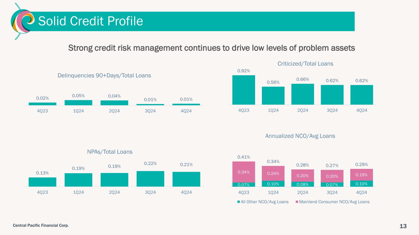 11Central Pacific Financial Corp. 42.5 46.7 44.2 0.0 10.0 20.0 30.0 40.0 50.0 60.0 4Q23 3Q24 4Q24 $ M il li o n s Noninterest Expense Noninterest Income and Expense 15.2 12.7 2.6 0.0 2.0 4.0 6.0 8.0 10.0 12.0 14.0 16.0 18.0 4Q23 3Q24 4Q24 $ M il li o n s Noninterest Income • Adjustments in 4Q23 include $5.1 million pre- tax gain on sale of a real estate property offset by $1.9 million in pre-tax loss on sales of investment securities • Opportunity to increase fee income through a growing Wealth management business, and customer swap program • Adjustments in 4Q23 and 3Q24 include $2.3 million in pre-tax branch lease termination expense and $3.1 million in pre-tax expenses related to a strategic opportunity respectively • Maintained relatively flat non-interest expenses in light of an inflationary environment • Priority on process improvements and expense management $9.9MM in pre-tax loss on investment repositioning 12.6 Note: Totals may not sum due to rounding. $3.2 million in adjustments $2.3 million in adjustments $3.1 million in adjustments