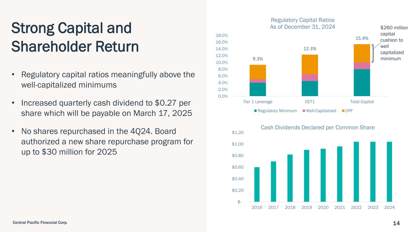 13Central Pacific Financial Corp. 0.13% 0.19% 0.19% 0.22% 0.21% 4Q23 1Q24 2Q24 3Q24 4Q24 NPAs/Total Loans 5 Strong credit risk management continues to drive low levels of problem assets Solid Credit Profile 0.02% 0.05% 0.04% 0.01% 0.01% 4Q23 1Q24 2Q24 3Q24 4Q24 Delinquencies 90+Days/Total Loans 0.92% 0.56% 0.66% 0.62% 0.62% 4Q23 1Q24 2Q24 3Q24 4Q24 Criticized/Total Loans 0.07% 0.10% 0.08% 0.07% 0.10% 0.34% 0.24% 0.20% 0.20% 0.19% 0.41% 0.34% 0.28% 0.27% 0.29% 4Q23 1Q24 2Q24 3Q24 4Q24 Annualized NCO/Avg Loans All Other NCO/Avg Loans Mainland Consumer NCO/Avg Loans