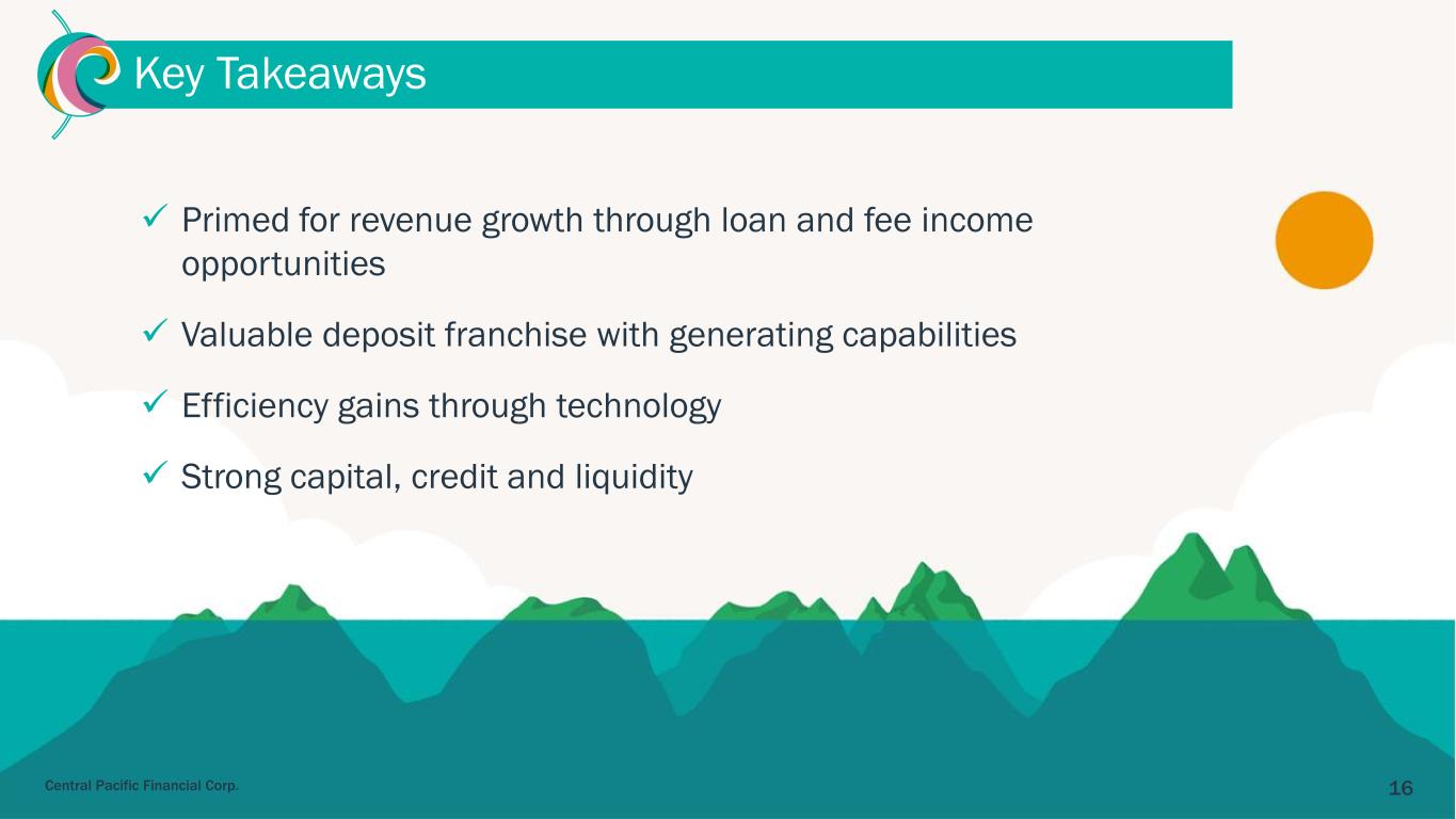 15Central Pacific Financial Corp. • Strong liquidity position with ample alternative sources • Available sources of liquidity total 113% of uninsured/uncollateralized deposits Available Sources of Liquidity $ Millions December 31, 2024 Cash on Balance Sheet 381$ Other Funding Sources: Unpledged Securities 558 FHLB Available Borrowing Capacity 1,627 FRB Available Borrowing Capacity 232 Other Funding Lines 75 Total 2,492$ Total Sources of Liquidity 2,873$ Uninsured/Uncollateralized Deposits 2,536$ % of Uninsured/Uncollateralized Deposits 113%