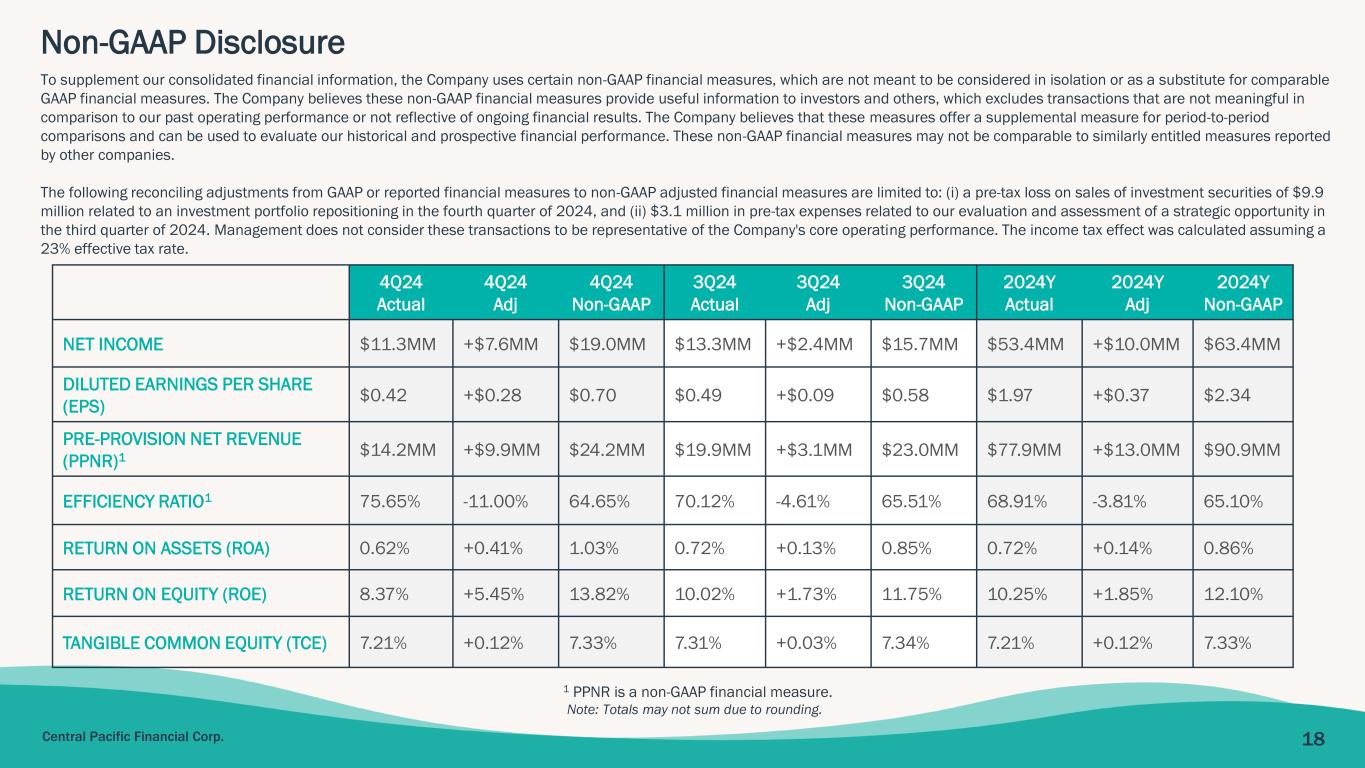 18Central Pacific Financial Corp. Non-GAAP Disclosure To supplement our consolidated financial information, the Company uses certain non-GAAP financial measures, which are not meant to be considered in isolation or as a substitute for comparable GAAP financial measures. The Company believes these non-GAAP financial measures provide useful information to investors and others, which excludes transactions that are not meaningful in comparison to our past operating performance or not reflective of ongoing financial results. The Company believes that these measures offer a supplemental measure for period-to-period comparisons and can be used to evaluate our historical and prospective financial performance. These non-GAAP financial measures may not be comparable to similarly entitled measures reported by other companies. The following reconciling adjustments from GAAP or reported financial measures to non-GAAP adjusted financial measures are limited to: (i) a pre-tax loss on sales of investment securities of $9.9 million related to an investment portfolio repositioning in the fourth quarter of 2024, and (ii) $3.1 million in pre-tax expenses related to our evaluation and assessment of a strategic opportunity in the third quarter of 2024. Management does not consider these transactions to be representative of the Company's core operating performance. The income tax effect was calculated assuming a 23% effective tax rate. 4Q24 Actual 4Q24 Adj 4Q24 Non-GAAP 3Q24 Actual 3Q24 Adj 3Q24 Non-GAAP 2024Y Actual 2024Y Adj 2024Y Non-GAAP NET INCOME $11.3MM +$7.6MM $19.0MM $13.3MM +$2.4MM $15.7MM $53.4MM +$10.0MM $63.4MM DILUTED EARNINGS PER SHARE (EPS) $0.42 +$0.28 $0.70 $0.49 +$0.09 $0.58 $1.97 +$0.37 $2.34 PRE-PROVISION NET REVENUE (PPNR)1 $14.2MM +$9.9MM $24.2MM $19.9MM +$3.1MM $23.0MM $77.9MM +$13.0MM $90.9MM EFFICIENCY RATIO1 75.65% -11.00% 64.65% 70.12% -4.61% 65.51% 68.91% -3.81% 65.10% RETURN ON ASSETS (ROA) 0.62% +0.41% 1.03% 0.72% +0.13% 0.85% 0.72% +0.14% 0.86% RETURN ON EQUITY (ROE) 8.37% +5.45% 13.82% 10.02% +1.73% 11.75% 10.25% +1.85% 12.10% TANGIBLE COMMON EQUITY (TCE) 7.21% +0.12% 7.33% 7.31% +0.03% 7.34% 7.21% +0.12% 7.33% Note: Totals may not sum due to rounding. 1 PPNR is a non-GAAP financial measure.
