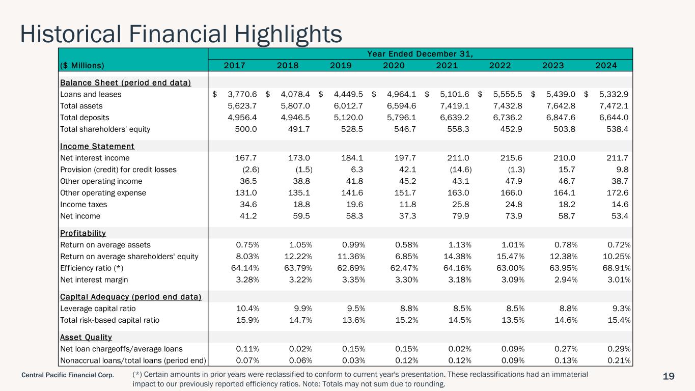 19Central Pacific Financial Corp. (*) Certain amounts in prior years were reclassified to conform to current year's presentation. These reclassifications had an immaterial impact to our previously reported efficiency ratios. Note: Totals may not sum due to rounding. Historical Financial Highlights ($ Millions) 2017 2018 2019 2020 2021 2022 2023 2024 Balance Sheet (period end data) Loans and leases 3,770.6$ 4,078.4$ 4,449.5$ 4,964.1$ 5,101.6$ 5,555.5$ 5,439.0$ 5,332.9$ Total assets 5,623.7 5,807.0 6,012.7 6,594.6 7,419.1 7,432.8 7,642.8 7,472.1 Total deposits 4,956.4 4,946.5 5,120.0 5,796.1 6,639.2 6,736.2 6,847.6 6,644.0 Total shareholders' equity 500.0 491.7 528.5 546.7 558.3 452.9 503.8 538.4 Income Statement Net interest income 167.7 173.0 184.1 197.7 211.0 215.6 210.0 211.7 Provision (credit) for credit losses (2.6) (1.5) 6.3 42.1 (14.6) (1.3) 15.7 9.8 Other operating income 36.5 38.8 41.8 45.2 43.1 47.9 46.7 38.7 Other operating expense 131.0 135.1 141.6 151.7 163.0 166.0 164.1 172.6 Income taxes 34.6 18.8 19.6 11.8 25.8 24.8 18.2 14.6 Net income 41.2 59.5 58.3 37.3 79.9 73.9 58.7 53.4 Prof itability Return on average assets 0.75% 1.05% 0.99% 0.58% 1.13% 1.01% 0.78% 0.72% Return on average shareholders' equity 8.03% 12.22% 11.36% 6.85% 14.38% 15.47% 12.38% 10.25% Efficiency ratio (*) 64.14% 63.79% 62.69% 62.47% 64.16% 63.00% 63.95% 68.91% Net interest margin 3.28% 3.22% 3.35% 3.30% 3.18% 3.09% 2.94% 3.01% Capital Adequacy (period end data) Leverage capital ratio 10.4% 9.9% 9.5% 8.8% 8.5% 8.5% 8.8% 9.3% Total risk-based capital ratio 15.9% 14.7% 13.6% 15.2% 14.5% 13.5% 14.6% 15.4% Asset Quality Net loan chargeoffs/average loans 0.11% 0.02% 0.15% 0.15% 0.02% 0.09% 0.27% 0.29% Nonaccrual loans/total loans (period end) 0.07% 0.06% 0.03% 0.12% 0.12% 0.09% 0.13% 0.21% Year Ended December 31,