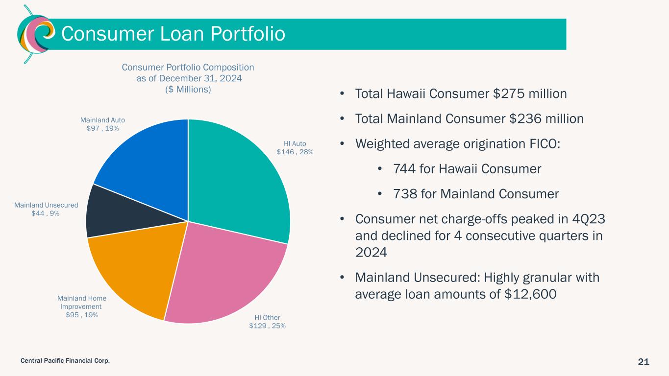20Central Pacific Financial Corp. Commercial Real Estate Portfolio OFFICE RETAIL TOTAL BALANCE $196.3MM $289.6MM % OF TOTAL CRE 13% 19% % OF TOTAL LOANS 4% 5% WA LTV 57% 65% WA MONTHS TO MATURITY 67 65 INVESTOR / OWNER- OCCUPIED $123.3MM / $73.0MM $211.4MM / $78.2MM• Hawaii 78% / Mainland 22% • Investor 75% / Owner-Occupied 25% Industrial/Warehouse 28% Retail 19% Apartment 20% Office 13% Hotel 11% Other 4% Shopping Center 3% Storage 2% CRE Portfolio Composition as of December 31, 2024