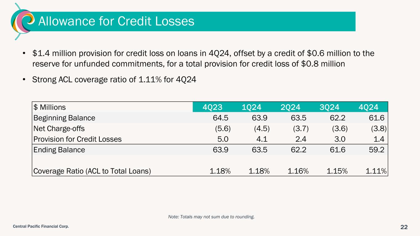 21Central Pacific Financial Corp. • Total Hawaii Consumer $275 million • Total Mainland Consumer $236 million • Weighted average origination FICO: • 744 for Hawaii Consumer • 738 for Mainland Consumer • Consumer net charge-offs peaked in 4Q23 and declined for 4 consecutive quarters in 2024 • Mainland Unsecured: Highly granular with average loan amounts of $12,600 Consumer Loan Portfolio HI Auto $146 , 28% HI Other $129 , 25% Mainland Home Improvement $95 , 19% Mainland Unsecured $44 , 9% Mainland Auto $97 , 19% Consumer Portfolio Composition as of December 31, 2024 ($ Millions)