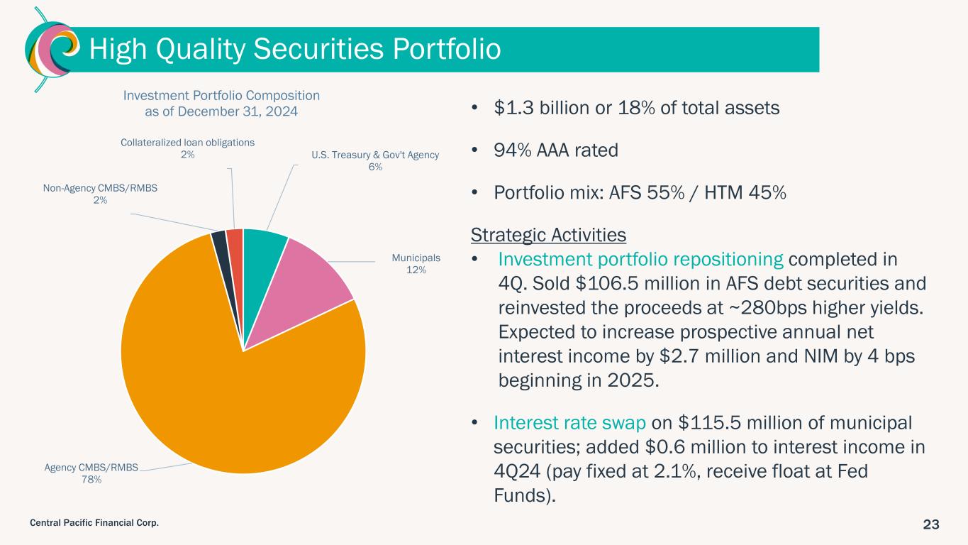 23Central Pacific Financial Corp. High Quality Securities Portfolio • $1.3 billion or 18% of total assets • 94% AAA rated • Portfolio mix: AFS 55% / HTM 45% Strategic Activities • Investment portfolio repositioning completed in 4Q. Sold $106.5 million in AFS debt securities and reinvested the proceeds at ~280bps higher yields. Expected to increase prospective annual net interest income by $2.7 million and NIM by 4 bps beginning in 2025. • Interest rate swap on $115.5 million of municipal securities; added $0.6 million to interest income in 4Q24 (pay fixed at 2.1%, receive float at Fed Funds). U.S. Treasury & Gov't Agency 6% Municipals 12% Agency CMBS/RMBS 78% Non-Agency CMBS/RMBS 2% Collateralized loan obligations 2% Investment Portfolio Composition as of December 31, 2024