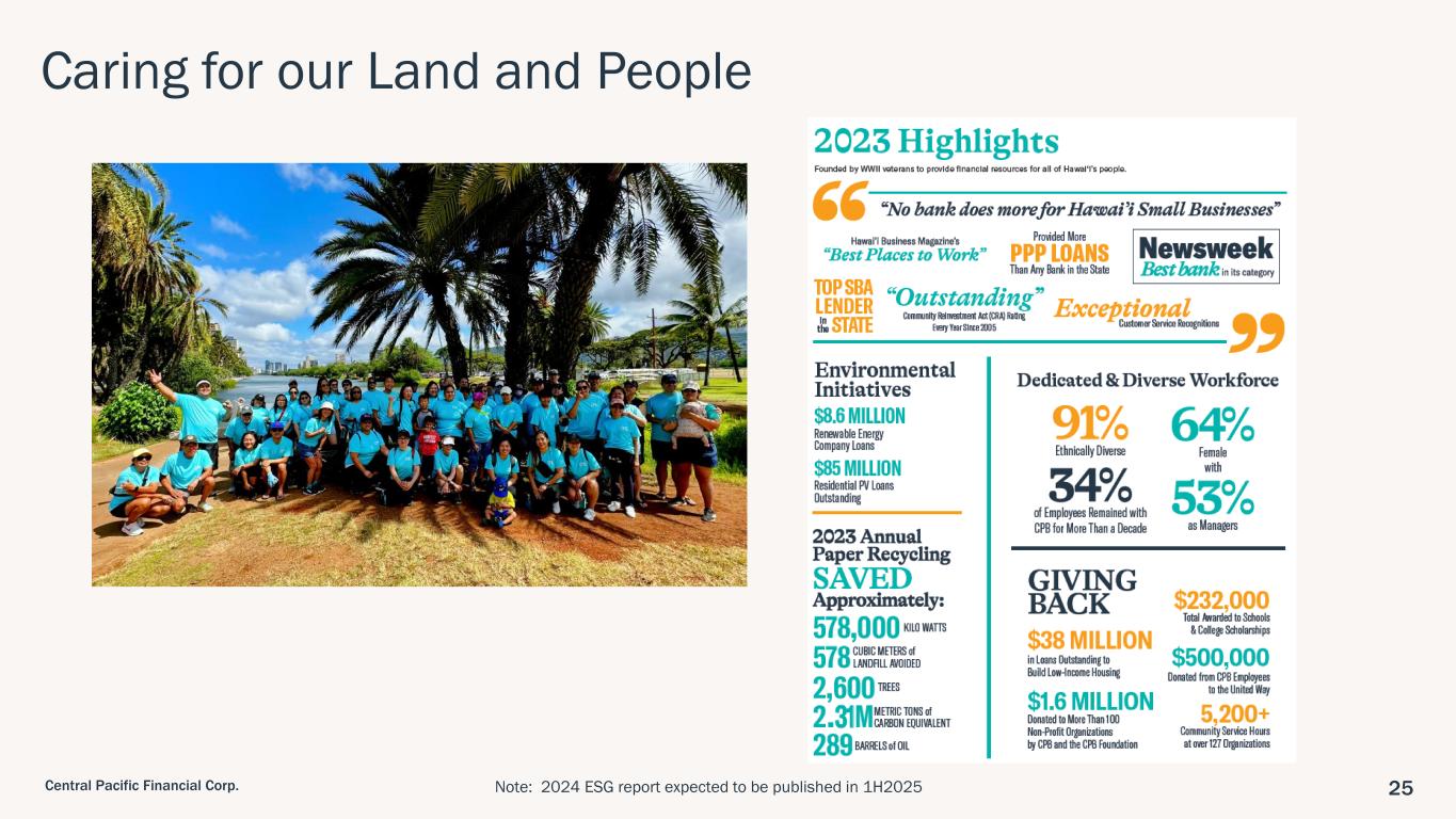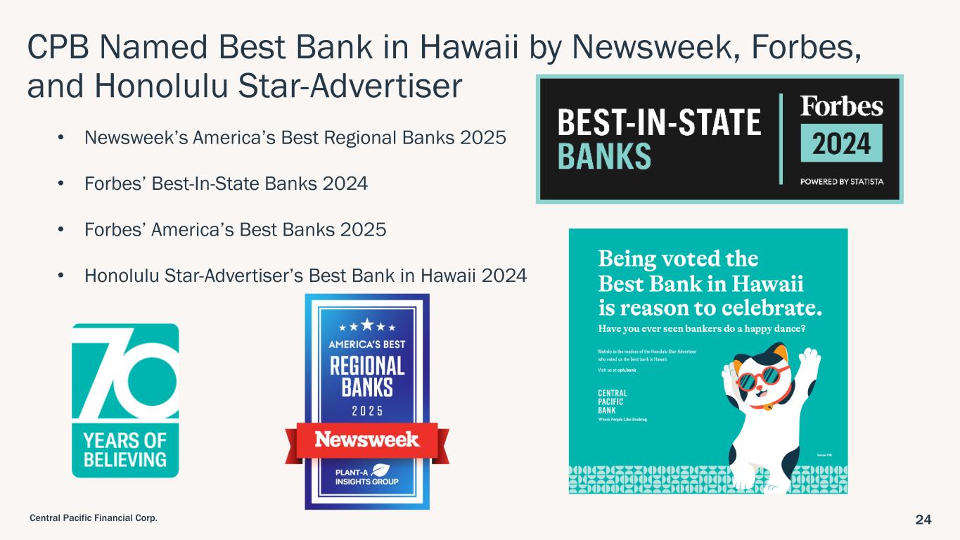 24Central Pacific Financial Corp. CPB Named Best Bank in Hawaii by Newsweek, Forbes, and Honolulu Star-Advertiser • Newsweek’s America’s Best Regional Banks 2025 • Forbes’ Best-In-State Banks 2024 • Forbes’ America’s Best Banks 2025 • Honolulu Star-Advertiser’s Best Bank in Hawaii 2024