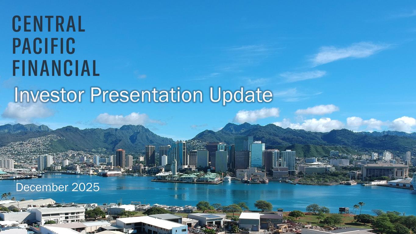 2Central Pacific Financial Corp. Forward-Looking Statements This document and any accompanied presentation, may contain forward-looking statements ("FLS") concerning, among other things: projections of revenues, expenses, income or loss, earnings or loss per share, capital expenditures, payment or nonpayment of dividends, net interest income, capital position, credit losses, net interest margin, or other financial items. These statements may also include the plans, objectives, and expectations of Central Pacific Financial Corp. (the "Company") or its management or Board of Directors, including those relating to business plans, use of capital resources, products or services, and regulatory developments or actions. In addition, such statements may address anticipated economic performance, the expected impact of business initiatives, and the assumptions underlying any of the foregoing. Words such as "believe," "plan," "anticipate," "aim," "seek," "expect," "intend," "forecast," "hope," "target," "continue," "remain,“ "estimate," "will," "should," "may," and other similar expressions are intended to identify FLS, although such terminology is not the exclusive means of doing so. While we believe that our FLS and their underlying assumptions are reasonably based, such statements are inherently subject to risks and uncertainties that may cause actual results to differ materially from expectations. Factors that may lead to such differences, include, but are not limited to: the persistence or resurgence of inflationary pressures in the United States and our market areas, and their effect on market interest rates, economic conditions, and credit quality; the impact of the current U.S. administration’s economic policies, including potential international tariffs, and other cost cutting initiatives; the adverse effects of bank failures on customer confidence, deposit behavior, liquidity, and regulatory responses; the effects of pandemics, epidemics, and other public health emergencies, including their impact on Hawaii's tourism and construction sectors and on our borrowers, customers, vendors and employees; supply chain disruptions, labor contract disputes, strikes; adverse trends in the real estate or construction industries, including rising inventory levels or declining property values; deterioration in borrowers' financial performance leading to increased loan delinquencies, asset quality issues, or loan losses; the impact of local, national, and international economic conditions and natural disasters (such as wildfires, volcanic eruptions, hurricanes, tsunamis, storms, or earthquakes) on our markets and major industries within Hawaii; weakness in domestic economic conditions, including instability in the financial industry, deterioration in real estate markets, and declines in consumer or business confidence; revisions to estimates of reserve requirements under applicable regulatory and accounting standards; the impact of legislative and regulatory developments, including the Dodd-Frank Act, changing capital and consumer protection rules, and new regulations affecting our operations and competitiveness; legal and regulatory proceedings, including actual or threatened litigation and the efforts of governmental and regulatory exams and orders, as well as the costs of ongoing or potential compliance efforts; the effects of accounting standard changes adopted by regulatory agencies, the PCAOB, or the FASB, and the cost and resources associated with implementation; changes in trade, monetary, or fiscal policy, including actions by the Federal Reserve; market volatility and monetary fluctuations, including the transition away from the LIBOR Index; declines in our market capitalization or the price of our common stock; the effects and cost of acquisitions, dispositions, or strategic transactions we may make or evaluate; political instability, acts of war, terrorism, or other geopolitical conflicts; shifts in consumer spending, borrowing, and savings behaviors; technological changes and developments; cybersecurity incidents, data privacy breaches, or fraud involving us or third-party vendors; deficiencies in internal control over financial reporting or disclosure controls, and our ability to remediate them; increased competition among financial institutions and other financial service providers; our ability to achieve efficiency ratio improvement goals; our ability to attract and retain key personnel; changes in our personnel, organization, compensation and benefit plans; and related reputational or regulatory exposures; and risks related to the United States fiscal debt, deficit, and budget uncertainties. For further information on factors that could cause actual results to differ materially from the expectations or projections expressed in our FLS, please refer to the Company's filings with the U.S. Securities and Exchange Commission, including the Company's most recent Forms 10-Q and 10-K, and particularly, the discussion of "Risk Factors" set forth therein. We urge investors to consider all of these factors carefully in evaluating the FLS contained in this document. FLS speak only as of the date on which such statements are made. We undertake no obligation to update any FLS to reflect events or circumstances occurring after the date on which such statements are made, or to reflect the occurrence of unanticipated events, except as required by law.