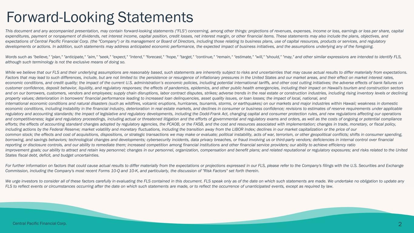 2Central Pacific Financial Corp. Forward-Looking Statements This document and any accompanied presentation, may contain forward-looking statements ("FLS") concerning, among other things: projections of revenues, expenses, income or loss, earnings or loss per share, capital expenditures, payment or nonpayment of dividends, net interest income, capital position, credit losses, net interest margin, or other financial items. These statements may also include the plans, objectives, and expectations of Central Pacific Financial Corp. (the "Company") or its management or Board of Directors, including those relating to business plans, use of capital resources, products or services, and regulatory developments or actions. In addition, such statements may address anticipated economic performance, the expected impact of business initiatives, and the assumptions underlying any of the foregoing. Words such as "believe," "plan," "anticipate," "aim," "seek," "expect," "intend," "forecast," "hope," "target," "continue," "remain,“ "estimate," "will," "should," "may," and other similar expressions are intended to identify FLS, although such terminology is not the exclusive means of doing so. While we believe that our FLS and their underlying assumptions are reasonably based, such statements are inherently subject to risks and uncertainties that may cause actual results to differ materially from expectations. Factors that may lead to such differences, include, but are not limited to: the persistence or resurgence of inflationary pressures in the United States and our market areas, and their effect on market interest rates, economic conditions, and credit quality; the impact of the current U.S. administration’s economic policies, including potential international tariffs, and other cost cutting initiatives; the adverse effects of bank failures on customer confidence, deposit behavior, liquidity, and regulatory responses; the effects of pandemics, epidemics, and other public health emergencies, including their impact on Hawaii's tourism and construction sectors and on our borrowers, customers, vendors and employees; supply chain disruptions, labor contract disputes, strikes; adverse trends in the real estate or construction industries, including rising inventory levels or declining property values; deterioration in borrowers' financial performance leading to increased loan delinquencies, asset quality issues, or loan losses; the impact of local, national, and international economic conditions and natural disasters (such as wildfires, volcanic eruptions, hurricanes, tsunamis, storms, or earthquakes) on our markets and major industries within Hawaii; weakness in domestic economic conditions, including instability in the financial industry, deterioration in real estate markets, and declines in consumer or business confidence; revisions to estimates of reserve requirements under applicable regulatory and accounting standards; the impact of legislative and regulatory developments, including the Dodd-Frank Act, changing capital and consumer protection rules, and new regulations affecting our operations and competitiveness; legal and regulatory proceedings, including actual or threatened litigation and the efforts of governmental and regulatory exams and orders, as well as the costs of ongoing or potential compliance efforts; the effects of accounting standard changes adopted by regulatory agencies, the PCAOB, or the FASB, and the cost and resources associated with implementation; changes in trade, monetary, or fiscal policy, including actions by the Federal Reserve; market volatility and monetary fluctuations, including the transition away from the LIBOR Index; declines in our market capitalization or the price of our common stock; the effects and cost of acquisitions, dispositions, or strategic transactions we may make or evaluate; political instability, acts of war, terrorism, or other geopolitical conflicts; shifts in consumer spending, borrowing, and savings behaviors; technological changes and developments; cybersecurity incidents, data privacy breaches, or fraud involving us or third-party vendors; deficiencies in internal control over financial reporting or disclosure controls, and our ability to remediate them; increased competition among financial institutions and other financial service providers; our ability to achieve efficiency ratio improvement goals; our ability to attract and retain key personnel; changes in our personnel, organization, compensation and benefit plans; and related reputational or regulatory exposures; and risks related to the United States fiscal debt, deficit, and budget uncertainties. For further information on factors that could cause actual results to differ materially from the expectations or projections expressed in our FLS, please refer to the Company's filings with the U.S. Securities and Exchange Commission, including the Company's most recent Forms 10-Q and 10-K, and particularly, the discussion of "Risk Factors" set forth therein. We urge investors to consider all of these factors carefully in evaluating the FLS contained in this document. FLS speak only as of the date on which such statements are made. We undertake no obligation to update any FLS to reflect events or circumstances occurring after the date on which such statements are made, or to reflect the occurrence of unanticipated events, except as required by law.