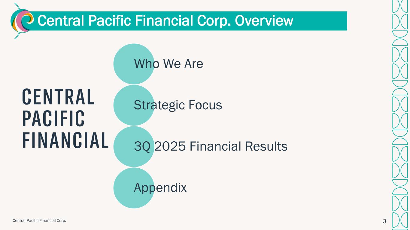 2Central Pacific Financial Corp. Forward-Looking Statements This document and any accompanied presentation, may contain forward-looking statements ("FLS") concerning, among other things: projections of revenues, expenses, income or loss, earnings or loss per share, capital expenditures, payment or nonpayment of dividends, net interest income, capital position, credit losses, net interest margin, or other financial items. These statements may also include the plans, objectives, and expectations of Central Pacific Financial Corp. (the "Company") or its management or Board of Directors, including those relating to business plans, use of capital resources, products or services, and regulatory developments or actions. In addition, such statements may address anticipated economic performance, the expected impact of business initiatives, and the assumptions underlying any of the foregoing. Words such as "believe," "plan," "anticipate," "aim," "seek," "expect," "intend," "forecast," "hope," "target," "continue," "remain,“ "estimate," "will," "should," "may," and other similar expressions are intended to identify FLS, although such terminology is not the exclusive means of doing so. While we believe that our FLS and their underlying assumptions are reasonably based, such statements are inherently subject to risks and uncertainties that may cause actual results to differ materially from expectations. Factors that may lead to such differences, include, but are not limited to: the persistence or resurgence of inflationary pressures in the United States and our market areas, and their effect on market interest rates, economic conditions, and credit quality; the impact of the current U.S. administration’s economic policies, including potential international tariffs, and other cost cutting initiatives; the adverse effects of bank failures on customer confidence, deposit behavior, liquidity, and regulatory responses; the effects of pandemics, epidemics, and other public health emergencies, including their impact on Hawaii's tourism and construction sectors and on our borrowers, customers, vendors and employees; supply chain disruptions, labor contract disputes, strikes; adverse trends in the real estate or construction industries, including rising inventory levels or declining property values; deterioration in borrowers' financial performance leading to increased loan delinquencies, asset quality issues, or loan losses; the impact of local, national, and international economic conditions and natural disasters (such as wildfires, volcanic eruptions, hurricanes, tsunamis, storms, or earthquakes) on our markets and major industries within Hawaii; weakness in domestic economic conditions, including instability in the financial industry, deterioration in real estate markets, and declines in consumer or business confidence; revisions to estimates of reserve requirements under applicable regulatory and accounting standards; the impact of legislative and regulatory developments, including the Dodd-Frank Act, changing capital and consumer protection rules, and new regulations affecting our operations and competitiveness; legal and regulatory proceedings, including actual or threatened litigation and the efforts of governmental and regulatory exams and orders, as well as the costs of ongoing or potential compliance efforts; the effects of accounting standard changes adopted by regulatory agencies, the PCAOB, or the FASB, and the cost and resources associated with implementation; changes in trade, monetary, or fiscal policy, including actions by the Federal Reserve; market volatility and monetary fluctuations, including the transition away from the LIBOR Index; declines in our market capitalization or the price of our common stock; the effects and cost of acquisitions, dispositions, or strategic transactions we may make or evaluate; political instability, acts of war, terrorism, or other geopolitical conflicts; shifts in consumer spending, borrowing, and savings behaviors; technological changes and developments; cybersecurity incidents, data privacy breaches, or fraud involving us or third-party vendors; deficiencies in internal control over financial reporting or disclosure controls, and our ability to remediate them; increased competition among financial institutions and other financial service providers; our ability to achieve efficiency ratio improvement goals; our ability to attract and retain key personnel; changes in our personnel, organization, compensation and benefit plans; and related reputational or regulatory exposures; and risks related to the United States fiscal debt, deficit, and budget uncertainties. For further information on factors that could cause actual results to differ materially from the expectations or projections expressed in our FLS, please refer to the Company's filings with the U.S. Securities and Exchange Commission, including the Company's most recent Forms 10-Q and 10-K, and particularly, the discussion of "Risk Factors" set forth therein. We urge investors to consider all of these factors carefully in evaluating the FLS contained in this document. FLS speak only as of the date on which such statements are made. We undertake no obligation to update any FLS to reflect events or circumstances occurring after the date on which such statements are made, or to reflect the occurrence of unanticipated events, except as required by law.