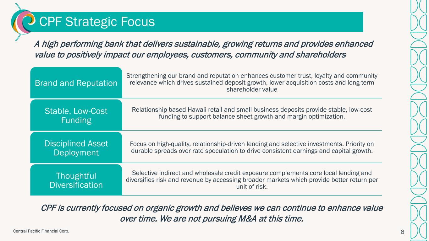 19Central Pacific Financial Corp. 5 Asset quality remained solid and in the expected operating range Solid Credit Profile Note: Totals may not sum due to rounding. 0.01% 0.01% 0.01% 0.04% 0.03% 3Q24 4Q24 1Q25 2Q25 3Q25 Delinquencies 90+Days/Total Loans 0.62% 0.62% 0.82% 1.80% 1.77% 3Q24 4Q24 1Q25 2Q25 3Q25 Criticized/Total Loans 0.22% 0.21% 0.21% 0.28% 0.27% 0.00% 0.50% 1.00% 1.50% 3Q24 4Q24 1Q25 2Q25 3Q25 NPAs/Total Loans 0.07% 0.10% 0.06% 0.21% 0.10% 0.20% 0.19% 0.13% 0.14% 0.10% 0.27% 0.29% 0.20% 0.35% 0.20% 3Q24 4Q24 1Q25 2Q25 3Q25 Annualized NCO/Avg Loans All Other NCO/Avg Loans Mainland Consumer NCO/Avg Loans