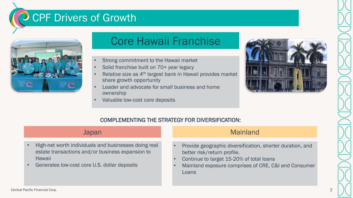 6Central Pacific Financial Corp. CPF Strategic Focus A high performing bank that delivers sustainable, growing returns and provides enhanced value to positively impact our employees, customers, community and shareholders Strengthening our brand and reputation enhances customer trust, loyalty and community relevance which drives sustained deposit growth, lower acquisition costs and long-term shareholder value Brand and Reputation Relationship based Hawaii retail and small business deposits provide stable, low-cost funding to support balance sheet growth and margin optimization. Stable, Low-Cost Funding Focus on high-quality, relationship-driven lending and selective investments. Priority on durable spreads over rate speculation to drive consistent earnings and capital growth. Disciplined Asset Deployment Selective indirect and wholesale credit exposure complements core local lending and diversifies risk and revenue by accessing broader markets which provide better return per unit of risk. Thoughtful Diversification CPF is currently focused on organic growth and believes we can continue to enhance value over time. We are not pursuing M&A at this time.
