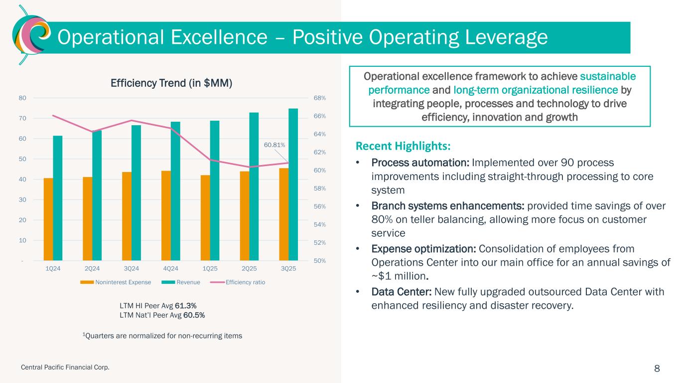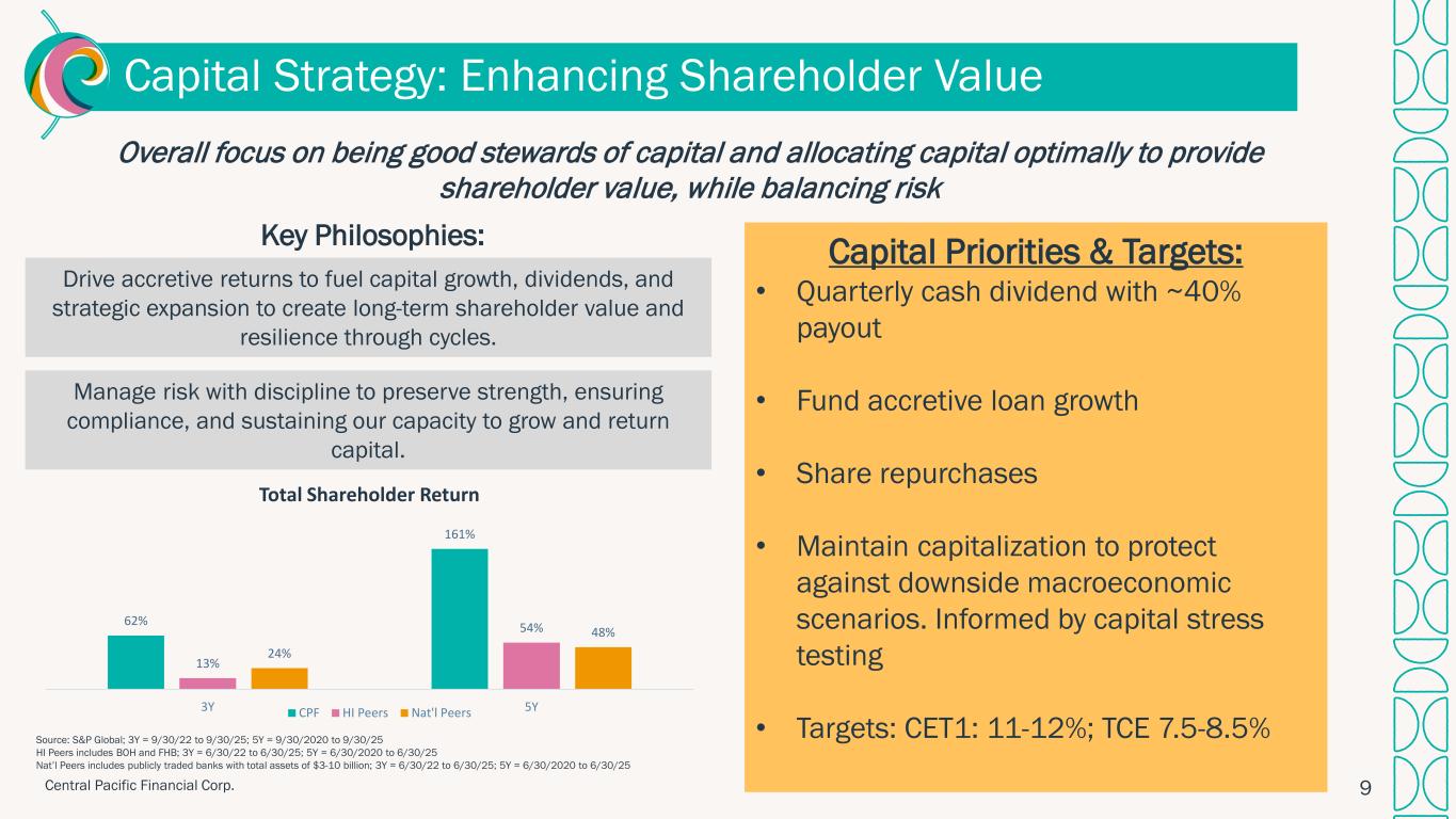 8Central Pacific Financial Corp. Operational Excellence – Positive Operating Leverage Recent Highlights: • Process automation: Implemented over 90 process improvements including straight-through processing to core system • Branch systems enhancements: provided time savings of over 80% on teller balancing, allowing more focus on customer service • Expense optimization: Consolidation of employees from Operations Center into our main office for an annual savings of ~$1 million. • Data Center: New fully upgraded outsourced Data Center with enhanced resiliency and disaster recovery.LTM HI Peer Avg 61.3% LTM Nat’l Peer Avg 60.5% 60.81% 50% 52% 54% 56% 58% 60% 62% 64% 66% 68% - 10 20 30 40 50 60 70 80 1Q24 2Q24 3Q24 4Q24 1Q25 2Q25 3Q25 Efficiency Trend (in $MM) Noninterest Expense Revenue Efficiency ratio 1Quarters are normalized for non-recurring items Operational excellence framework to achieve sustainable performance and long-term organizational resilience by integrating people, processes and technology to drive efficiency, innovation and growth