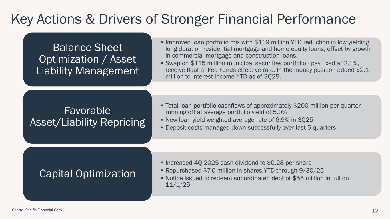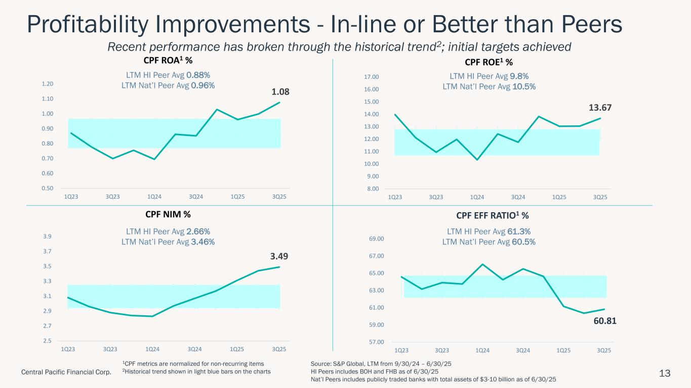 12Central Pacific Financial Corp. Key Actions & Drivers of Stronger Financial Performance • Improved loan portfolio mix with $119 million YTD reduction in low yielding, long duration residential mortgage and home equity loans, offset by growth in commercial mortgage and construction loans. • Swap on $115 million municipal securities portfolio - pay fixed at 2.1%, receive float at Fed Funds effective rate. In the money position added $2.1 million to interest income YTD as of 3Q25. Balance Sheet Optimization / Asset Liability Management • Total loan portfolio cashflows of approximately $200 million per quarter, running off at average portfolio yield of 5.0% • New loan yield weighted average rate of 6.9% in 3Q25 • Deposit costs managed down successfully over last 5 quarters Favorable Asset/Liability Repricing • Increased 4Q 2025 cash dividend to $0.28 per share • Repurchased $7.0 million in shares YTD through 9/30/25 • Notice issued to redeem subordinated debt of $55 million in full on 11/1/25 Capital Optimization