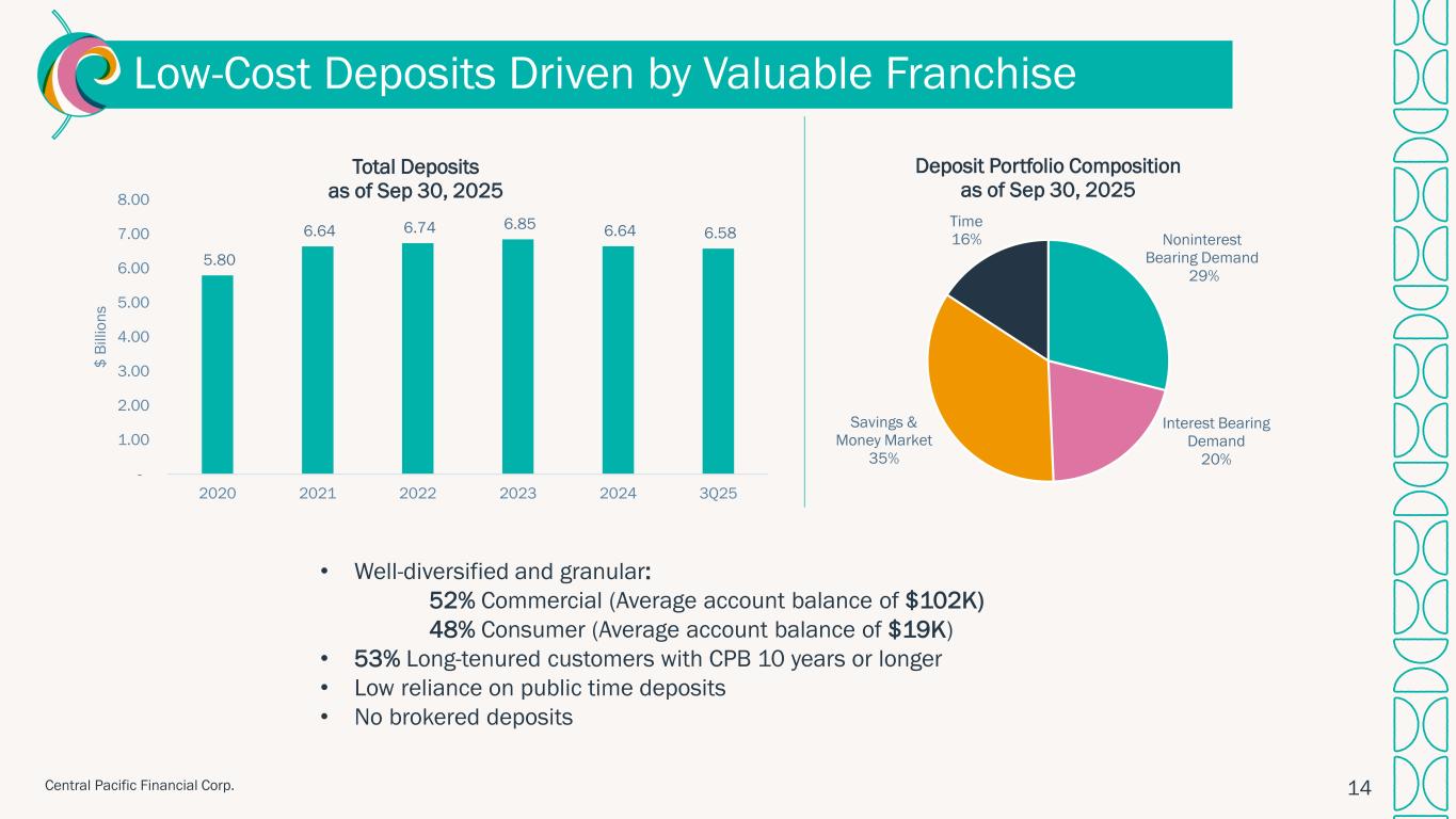 13Central Pacific Financial Corp. Profitability Improvements - In-line or Better than Peers Recent performance has broken through the historical trend2; initial targets achieved 1CPF metrics are normalized for non-recurring items 2Historical trend shown in light blue bars on the charts 3.49 2.5 2.7 2.9 3.1 3.3 3.5 3.7 3.9 1Q23 3Q23 1Q24 3Q24 1Q25 3Q25 CPF NIM % LTM HI Peer Avg 2.66% LTM Nat’l Peer Avg 3.46% 1.08 0.50 0.60 0.70 0.80 0.90 1.00 1.10 1.20 1Q23 3Q23 1Q24 3Q24 1Q25 3Q25 CPF ROA1 % LTM HI Peer Avg 0.88% LTM Nat’l Peer Avg 0.96% 13.67 8.00 9.00 10.00 11.00 12.00 13.00 14.00 15.00 16.00 17.00 1Q23 3Q23 1Q24 3Q24 1Q25 3Q25 CPF ROE1 % LTM HI Peer Avg 9.8% LTM Nat’l Peer Avg 10.5% 60.81 57.00 59.00 61.00 63.00 65.00 67.00 69.00 1Q23 3Q23 1Q24 3Q24 1Q25 3Q25 CPF EFF RATIO1 % LTM HI Peer Avg 61.3% LTM Nat’l Peer Avg 60.5% Source: S&P Global, LTM from 9/30/24 – 6/30/25 HI Peers includes BOH and FHB as of 6/30/25 Nat’l Peers includes publicly traded banks with total assets of $3-10 billion as of 6/30/25