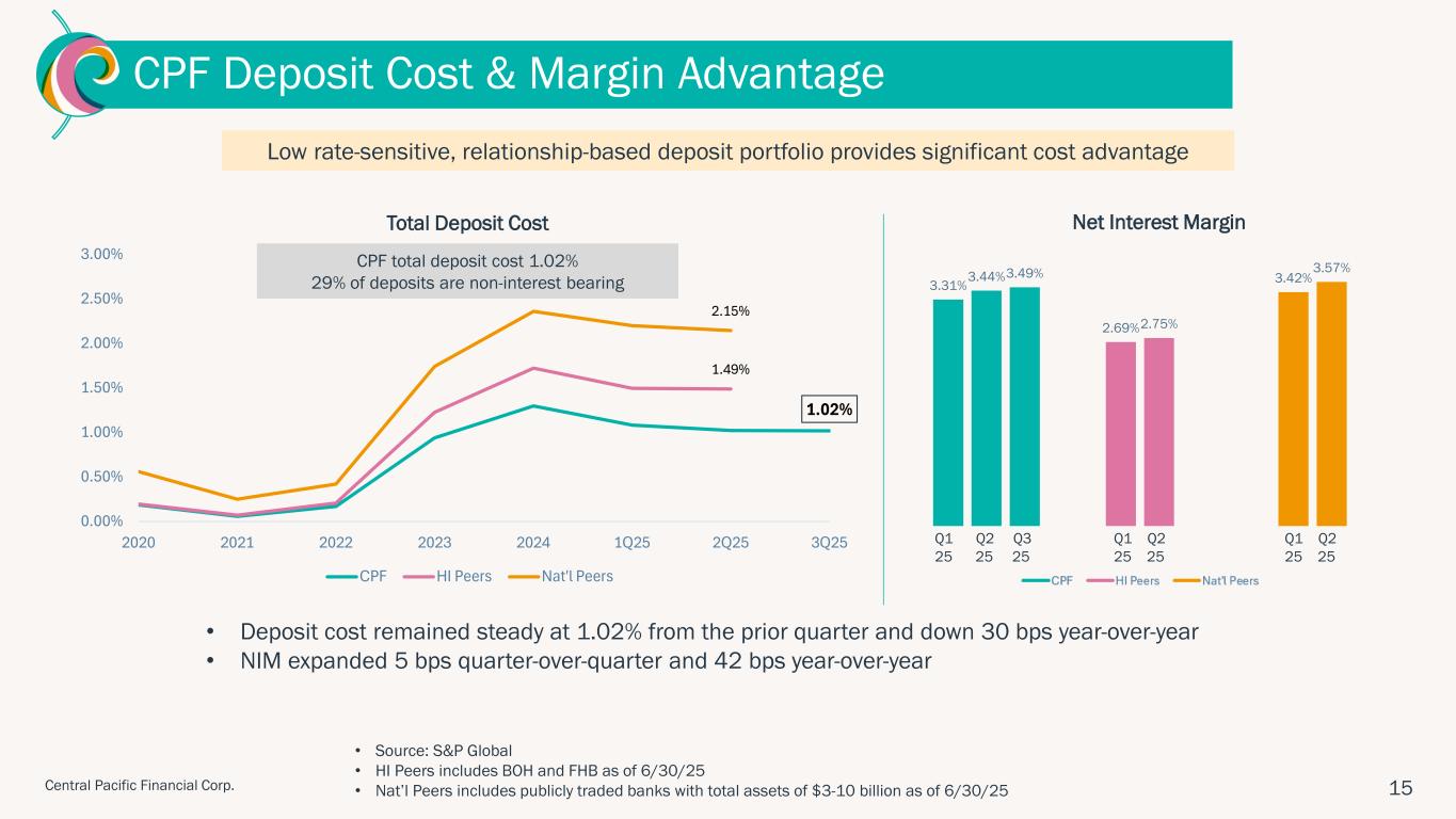 14Central Pacific Financial Corp. Low-Cost Deposits Driven by Valuable Franchise • Well-diversified and granular: 52% Commercial (Average account balance of $102K) 48% Consumer (Average account balance of $19K) • 53% Long-tenured customers with CPB 10 years or longer • Low reliance on public time deposits • No brokered deposits Noninterest Bearing Demand 29% Interest Bearing Demand 20% Savings & Money Market 35% Time 16% Deposit Portfolio Composition as of Sep 30, 2025 5.80 6.64 6.74 6.85 6.64 6.58 - 1.00 2.00 3.00 4.00 5.00 6.00 7.00 8.00 2020 2021 2022 2023 2024 3Q25 $ Bi lli on s Total Deposits as of Sep 30, 2025