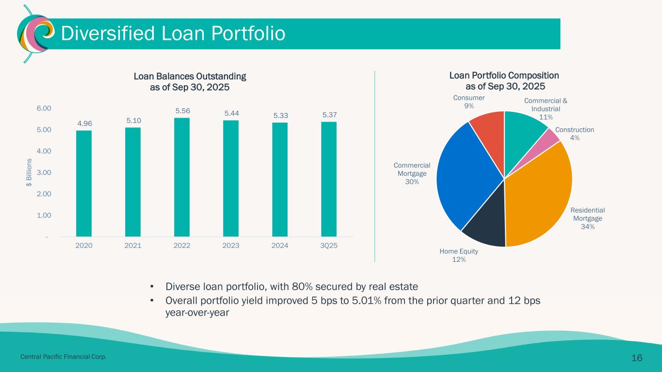 15Central Pacific Financial Corp. 1.02% 1.49% 2.15% 0.00% 0.50% 1.00% 1.50% 2.00% 2.50% 3.00% 2020 2021 2022 2023 2024 1Q25 2Q25 3Q25 Total Deposit Cost CPF HI Peers Nat'l Peers • Source: S&P Global • HI Peers includes BOH and FHB as of 6/30/25 • Nat’l Peers includes publicly traded banks with total assets of $3-10 billion as of 6/30/25 Low rate-sensitive, relationship-based deposit portfolio provides significant cost advantage CPF total deposit cost 1.02% 29% of deposits are non-interest bearing CPF Deposit Cost & Margin Advantage 3.31% 2.69% 3.42%3.44% 2.75% 3.57%3.49% Net Interest Margin Q1 Q2 Q3 25 25 25 Q1 Q2 25 25 Q1 Q2 25 25 • Deposit cost remained steady at 1.02% from the prior quarter and down 30 bps year-over-year • NIM expanded 5 bps quarter-over-quarter and 42 bps year-over-year