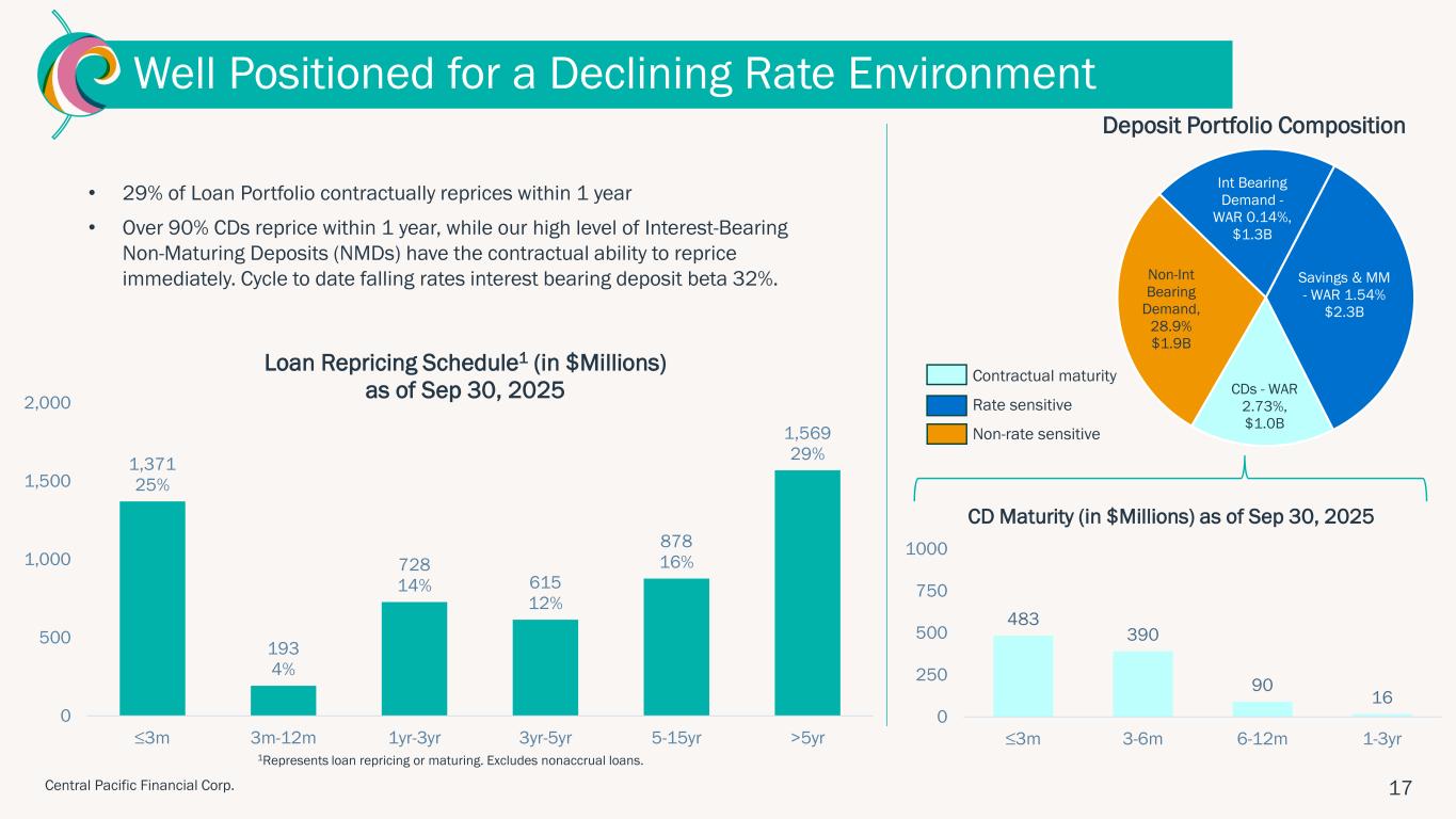 16Central Pacific Financial Corp. Diversified Loan Portfolio • Diverse loan portfolio, with 80% secured by real estate • Overall portfolio yield improved 5 bps to 5.01% from the prior quarter and 12 bps year-over-year Commercial & Industrial 11% Construction 4% Residential Mortgage 34% Home Equity 12% Commercial Mortgage 30% Consumer 9% Loan Portfolio Composition as of Sep 30, 2025 4.96 5.10 5.56 5.44 5.33 5.37 - 1.00 2.00 3.00 4.00 5.00 6.00 2020 2021 2022 2023 2024 3Q25 $ Bi lli on s Loan Balances Outstanding as of Sep 30, 2025