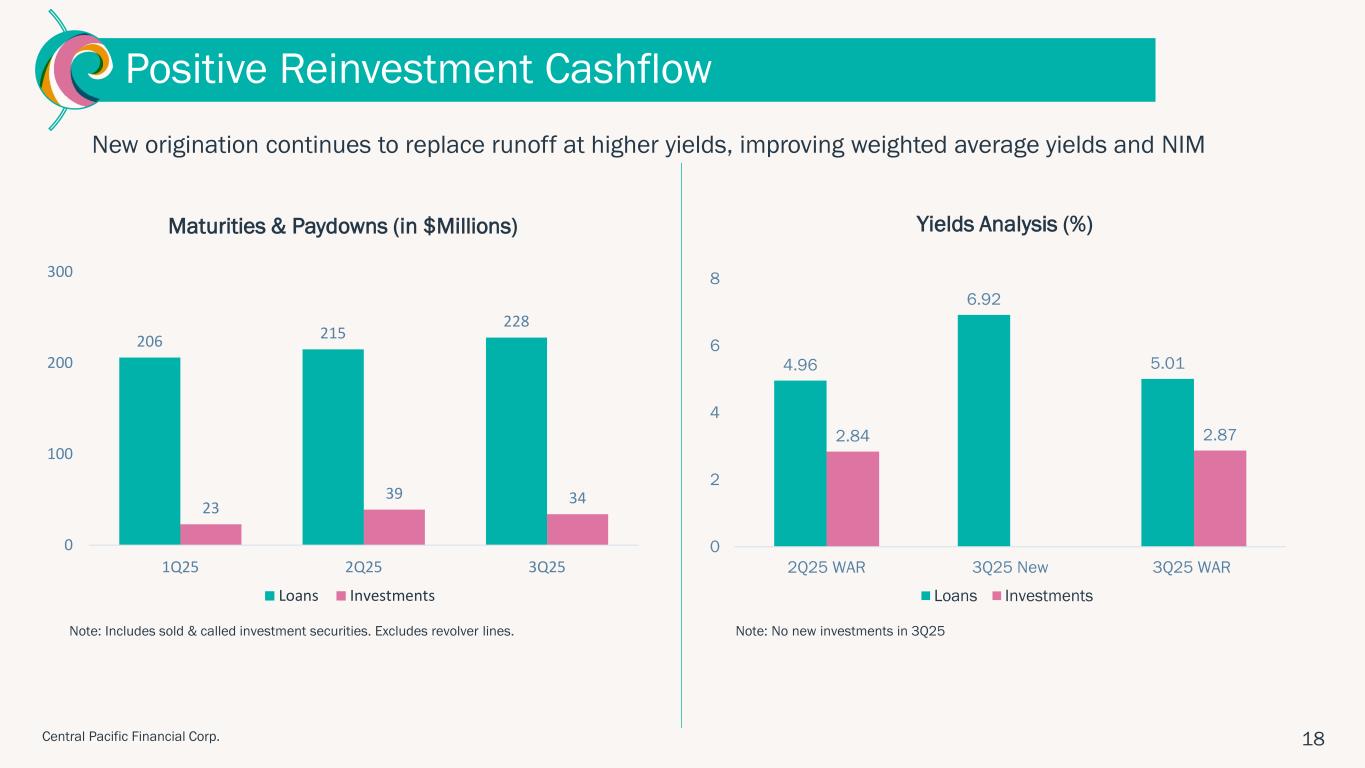 17Central Pacific Financial Corp. Well Positioned for a Declining Rate Environment • 29% of Loan Portfolio contractually reprices within 1 year • Over 90% CDs reprice within 1 year, while our high level of Interest-Bearing Non-Maturing Deposits (NMDs) have the contractual ability to reprice immediately. Cycle to date falling rates interest bearing deposit beta 32%. 483 390 90 16 0 250 500 750 1000 ≤3m 3-6m 6-12m 1-3yr CD Maturity (in $Millions) as of Sep 30, 2025 1,371 25% 193 4% 728 14% 615 12% 878 16% 1,569 29% 0 500 1,000 1,500 2,000 ≤3m 3m-12m 1yr-3yr 3yr-5yr 5-15yr >5yr Loan Repricing Schedule1 (in $Millions) as of Sep 30, 2025 Contractual maturity Rate sensitive Non-rate sensitive Non-Int Bearing Demand, 28.9% $1.9B Int Bearing Demand - WAR 0.14%, $1.3B Savings & MM - WAR 1.54% $2.3B CDs - WAR 2.73%, $1.0B Deposit Portfolio Composition 1Represents loan repricing or maturing. Excludes nonaccrual loans.