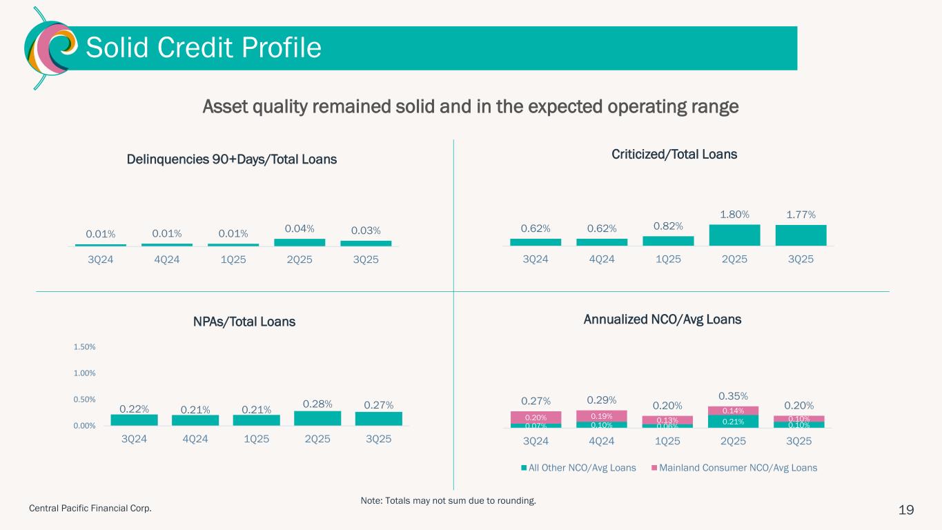 18Central Pacific Financial Corp. Positive Reinvestment Cashflow New origination continues to replace runoff at higher yields, improving weighted average yields and NIM Note: Includes sold & called investment securities. Excludes revolver lines. 4.96 6.92 5.01 2.84 2.87 0 2 4 6 8 2Q25 WAR 3Q25 New 3Q25 WAR Yields Analysis (%) Loans Investments Note: No new investments in 3Q25 206 215 228 23 39 34 0 100 200 300 1Q25 2Q25 3Q25 Maturities & Paydowns (in $Millions) Loans Investments