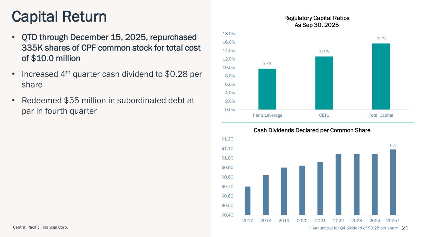 212Central Pacific Financial Corp. Capital Return • QTD through December 15, 2025, repurchased 335K shares of CPF common stock for total cost of $10.0 million • Increased 4th quarter cash dividend to $0.28 per share • Redeemed $55 million in subordinated debt at par in fourth quarter * Annualized for Q4 dividend of $0.28 per share 1.09 $0.40 $0.50 $0.60 $0.70 $0.80 $0.90 $1.00 $1.10 $1.20 2017 2018 2019 2020 2021 2022 2023 2024 2025* Cash Dividends Declared per Common Share 9.7% 12.6% 15.7% 0.0% 2.0% 4.0% 6.0% 8.0% 10.0% 12.0% 14.0% 16.0% 18.0% Tier 1 Leverage CET1 Total Capital Regulatory Capital Ratios As Sep 30, 2025