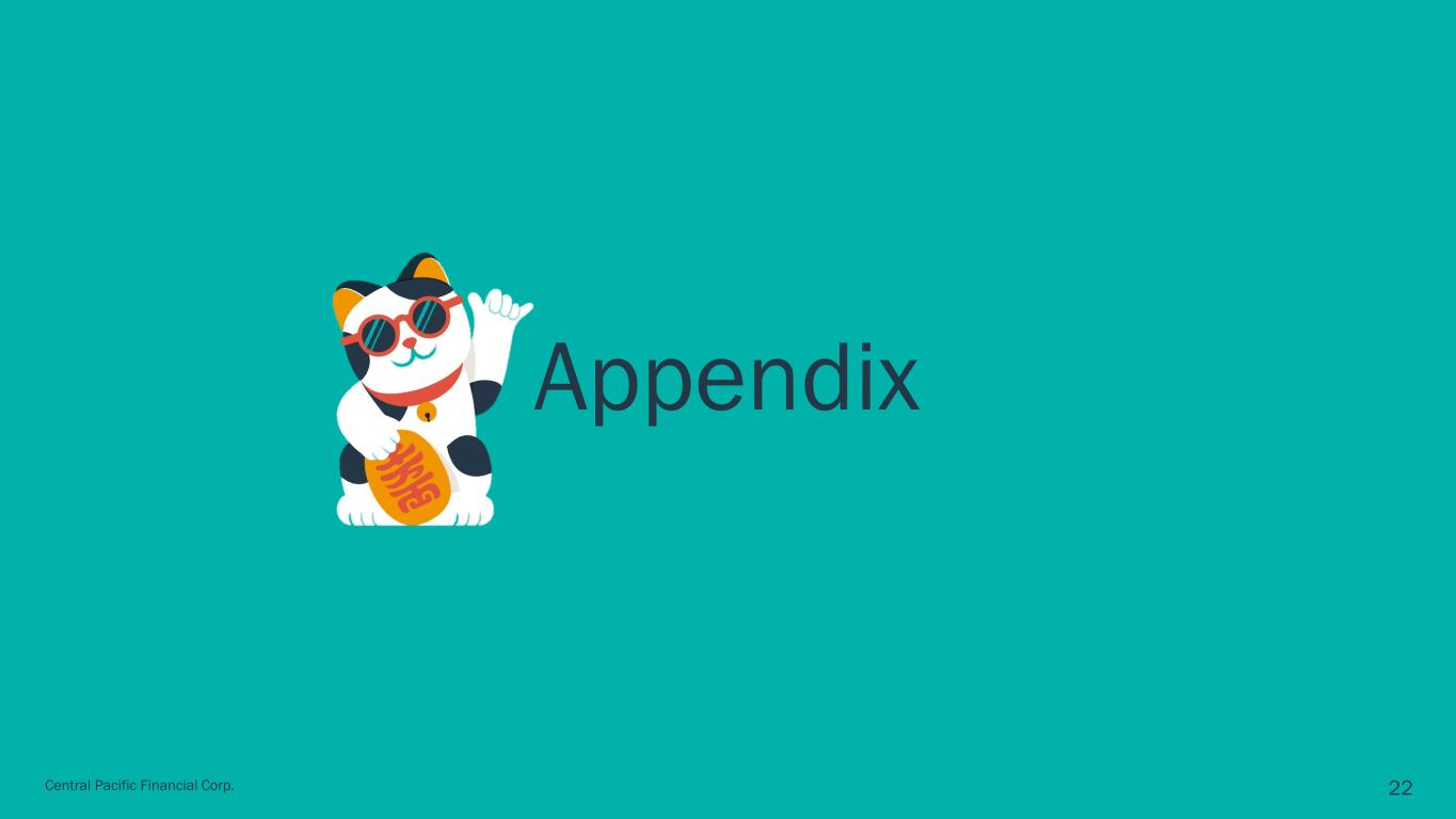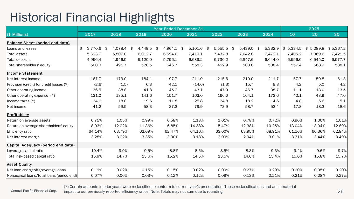 26Central Pacific Financial Corp. (*) Certain amounts in prior years were reclassified to conform to current year's presentation. These reclassifications had an immaterial impact to our previously reported efficiency ratios. Note: Totals may not sum due to rounding. Historical Financial Highlights ($ Millions) 2017 2018 2019 2020 2021 2022 2023 2024 1Q 2Q 3Q Balance Sheet (period end data) Loans and leases 3,770.6$ 4,078.4$ 4,449.5$ 4,964.1$ 5,101.6$ 5,555.5$ 5,439.0$ 5,332.9$ 5,334.5$ 5,289.8$ 5,367.2$ Total assets 5,623.7 5,807.0 6,012.7 6,594.6 7,419.1 7,432.8 7,642.8 7,472.1 7,405.2 7,369.6 7,421.5 Total deposits 4,956.4 4,946.5 5,120.0 5,796.1 6,639.2 6,736.2 6,847.6 6,644.0 6,596.0 6,545.0 6,577.7 Total shareholders' equity 500.0 491.7 528.5 546.7 558.3 452.9 503.8 538.4 557.4 568.9 588.1 Income Statement Net interest income 167.7 173.0 184.1 197.7 211.0 215.6 210.0 211.7 57.7 59.8 61.3 Provision (credit) for credit losses (*) (2.6) (1.5) 6.3 42.1 (14.6) (1.3) 15.7 9.8 4.2 5.0 4.2 Other operating income 36.5 38.8 41.8 45.2 43.1 47.9 46.7 38.7 11.1 13.0 13.5 Other operating expense (*) 131.0 135.1 141.6 151.7 163.0 166.0 164.1 172.6 42.1 43.9 47.0 Income taxes (*) 34.6 18.8 19.6 11.8 25.8 24.8 18.2 14.6 4.8 5.6 5.1 Net income 41.2 59.5 58.3 37.3 79.9 73.9 58.7 53.4 17.8 18.3 18.6 Prof itability Return on average assets 0.75% 1.05% 0.99% 0.58% 1.13% 1.01% 0.78% 0.72% 0.96% 1.00% 1.01% Return on average shareholders' equity 8.03% 12.22% 11.36% 6.85% 14.38% 15.47% 12.38% 10.25% 13.04% 13.04% 12.89% Efficiency ratio 64.14% 63.79% 62.69% 62.47% 64.16% 63.00% 63.95% 68.91% 61.16% 60.36% 62.84% Net interest margin 3.28% 3.22% 3.35% 3.30% 3.18% 3.09% 2.94% 3.01% 3.31% 3.44% 3.49% Capital Adequacy (period end data) Leverage capital ratio 10.4% 9.9% 9.5% 8.8% 8.5% 8.5% 8.8% 9.3% 9.4% 9.6% 9.7% Total risk-based capital ratio 15.9% 14.7% 13.6% 15.2% 14.5% 13.5% 14.6% 15.4% 15.6% 15.8% 15.7% Asset Quality Net loan chargeoffs/average loans 0.11% 0.02% 0.15% 0.15% 0.02% 0.09% 0.27% 0.29% 0.20% 0.35% 0.20% Nonaccrual loans/total loans (period end) 0.07% 0.06% 0.03% 0.12% 0.12% 0.09% 0.13% 0.21% 0.21% 0.28% 0.27% Year Ended December 31, 2025