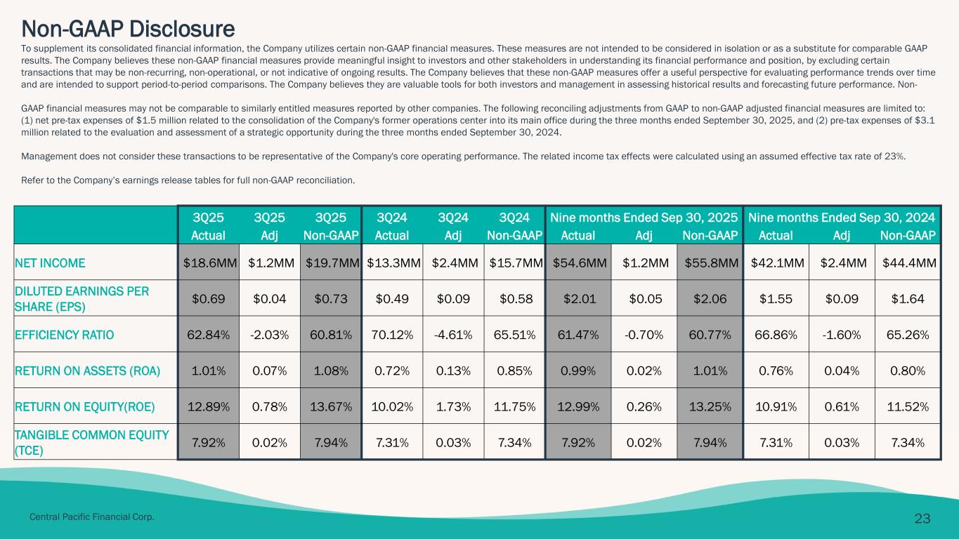 23Central Pacific Financial Corp. Non-GAAP Disclosure To supplement its consolidated financial information, the Company utilizes certain non-GAAP financial measures. These measures are not intended to be considered in isolation or as a substitute for comparable GAAP results. The Company believes these non-GAAP financial measures provide meaningful insight to investors and other stakeholders in understanding its financial performance and position, by excluding certain transactions that may be non-recurring, non-operational, or not indicative of ongoing results. The Company believes that these non-GAAP measures offer a useful perspective for evaluating performance trends over time and are intended to support period-to-period comparisons. The Company believes they are valuable tools for both investors and management in assessing historical results and forecasting future performance. Non- GAAP financial measures may not be comparable to similarly entitled measures reported by other companies. The following reconciling adjustments from GAAP to non-GAAP adjusted financial measures are limited to: (1) net pre-tax expenses of $1.5 million related to the consolidation of the Company's former operations center into its main office during the three months ended September 30, 2025, and (2) pre-tax expenses of $3.1 million related to the evaluation and assessment of a strategic opportunity during the three months ended September 30, 2024. Management does not consider these transactions to be representative of the Company's core operating performance. The related income tax effects were calculated using an assumed effective tax rate of 23%. Refer to the Company’s earnings release tables for full non-GAAP reconciliation. 3Q25 3Q25 3Q25 3Q24 3Q24 3Q24 Nine months Ended Sep 30, 2025 Nine months Ended Sep 30, 2024 Actual Adj Non-GAAP Actual Adj Non-GAAP Actual Adj Non-GAAP Actual Adj Non-GAAP NET INCOME $18.6MM $1.2MM $19.7MM $13.3MM $2.4MM $15.7MM $54.6MM $1.2MM $55.8MM $42.1MM $2.4MM $44.4MM DILUTED EARNINGS PER SHARE (EPS) $0.69 $0.04 $0.73 $0.49 $0.09 $0.58 $2.01 $0.05 $2.06 $1.55 $0.09 $1.64 EFFICIENCY RATIO 62.84% -2.03% 60.81% 70.12% -4.61% 65.51% 61.47% -0.70% 60.77% 66.86% -1.60% 65.26% RETURN ON ASSETS (ROA) 1.01% 0.07% 1.08% 0.72% 0.13% 0.85% 0.99% 0.02% 1.01% 0.76% 0.04% 0.80% RETURN ON EQUITY(ROE) 12.89% 0.78% 13.67% 10.02% 1.73% 11.75% 12.99% 0.26% 13.25% 10.91% 0.61% 11.52% TANGIBLE COMMON EQUITY (TCE) 7.92% 0.02% 7.94% 7.31% 0.03% 7.34% 7.92% 0.02% 7.94% 7.31% 0.03% 7.34%