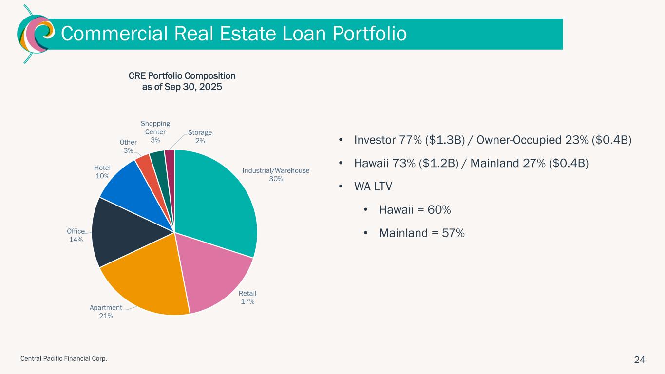 24Central Pacific Financial Corp. Commercial Real Estate Loan Portfolio • Investor 77% ($1.3B) / Owner-Occupied 23% ($0.4B) • Hawaii 73% ($1.2B) / Mainland 27% ($0.4B) • WA LTV • Hawaii = 60% • Mainland = 57% Industrial/Warehouse 30% Retail 17% Apartment 21% Office 14% Hotel 10% Other 3% Shopping Center 3% Storage 2% CRE Portfolio Composition as of Sep 30, 2025