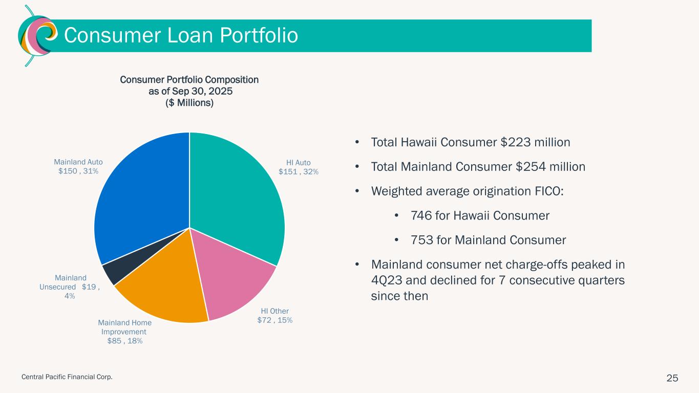 25Central Pacific Financial Corp. • Total Hawaii Consumer $223 million • Total Mainland Consumer $254 million • Weighted average origination FICO: • 746 for Hawaii Consumer • 753 for Mainland Consumer • Mainland consumer net charge-offs peaked in 4Q23 and declined for 7 consecutive quarters since then Consumer Loan Portfolio HI Auto $151 , 32% HI Other $72 , 15%Mainland Home Improvement $85 , 18% Mainland Unsecured $19 , 4% Mainland Auto $150 , 31% Consumer Portfolio Composition as of Sep 30, 2025 ($ Millions)
