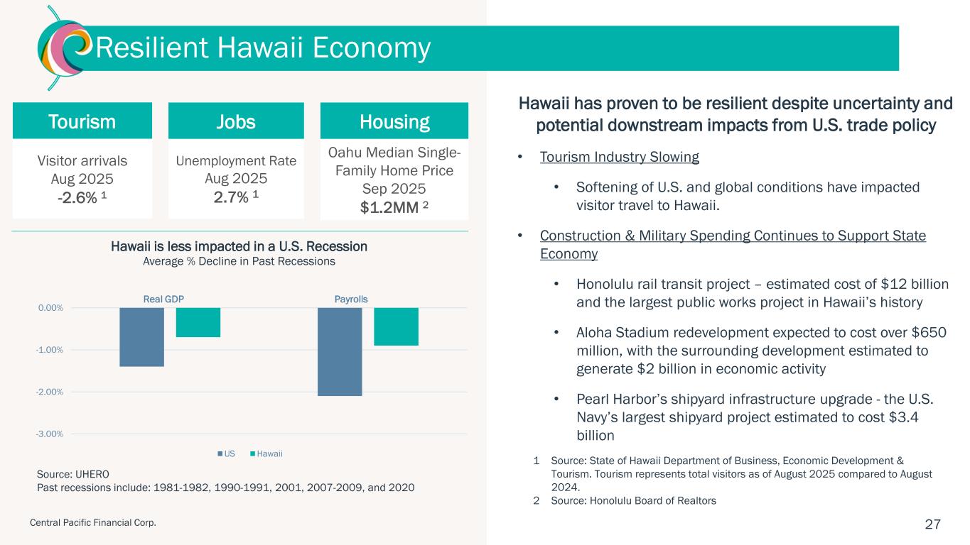 272Central Pacific Financial Corp. Tourism Visitor arrivals Aug 2025 -2.6% 1 Jobs Unemployment Rate Aug 2025 2.7% 1 Hawaii has proven to be resilient despite uncertainty and potential downstream impacts from U.S. trade policy • Tourism Industry Slowing • Softening of U.S. and global conditions have impacted visitor travel to Hawaii. • Construction & Military Spending Continues to Support State Economy • Honolulu rail transit project – estimated cost of $12 billion and the largest public works project in Hawaii’s history • Aloha Stadium redevelopment expected to cost over $650 million, with the surrounding development estimated to generate $2 billion in economic activity • Pearl Harbor’s shipyard infrastructure upgrade - the U.S. Navy’s largest shipyard project estimated to cost $3.4 billion 1 Source: State of Hawaii Department of Business, Economic Development & Tourism. Tourism represents total visitors as of August 2025 compared to August 2024. 2 Source: Honolulu Board of Realtors Resilient Hawaii Economy Housing Oahu Median Single- Family Home Price Sep 2025 $1.2MM 2 -3.00% -2.00% -1.00% 0.00% Hawaii is less impacted in a U.S. Recession Average % Decline in Past Recessions US Hawaii Real GDP Source: UHERO Past recessions include: 1981-1982, 1990-1991, 2001, 2007-2009, and 2020 Payrolls
