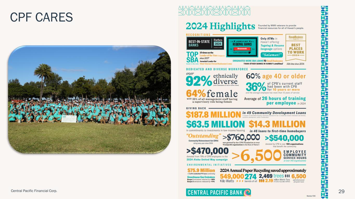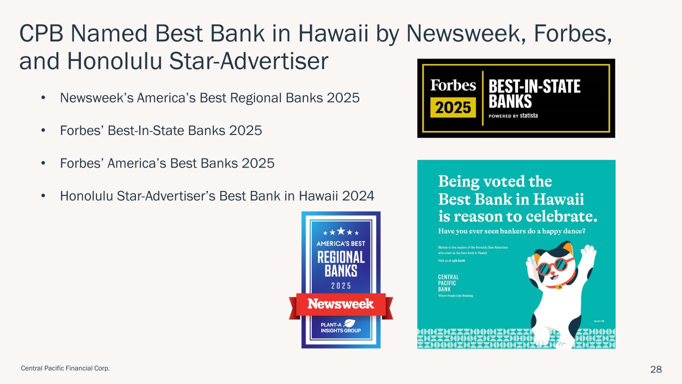 28Central Pacific Financial Corp. CPB Named Best Bank in Hawaii by Newsweek, Forbes, and Honolulu Star-Advertiser • Newsweek’s America’s Best Regional Banks 2025 • Forbes’ Best-In-State Banks 2025 • Forbes’ America’s Best Banks 2025 • Honolulu Star-Advertiser’s Best Bank in Hawaii 2024
