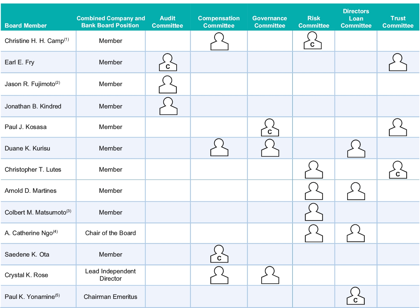 ![]() Lead Independent Director DIRECTOR SINCE: 2005 AGE: 66 COMMITTEE(S): • Compensation • Governance | | | Ms. Rose is a name partner in the law firm of Lung Rose Voss & Wagnild and has been actively practicing law for 42 years, specializing in the areas of real estate, trust and commercial litigation, commercial real estate transactions, trusts and estates, and construction law. Ms. Rose has been a director of Hawaiian Holdings, Inc. (a publicly traded company listed on NASDAQ, and the parent company of Hawaiian Airlines, Inc.) since June 2006, and serves as Chair of the Compensation Committee, and is a member of the Governance and Nominating Committee of its Board of Directors. Ms. Rose also brings a wealth of legal and real estate knowledge and experience to the Company’s Board and Bank’s Board, and her professional, leadership, and business skills and expertise are well-suited to her serving since June 1, 2014, as the Company’s and the Bank’s Lead Independent Director, and before that, from April 20, 2011 through May 31, 2014, serving as the Company’s and Bank’s Board Chair, and in providing guidance with respect to the Company’s and the Bank’s strategic issues, overall business plans and legal matters. BACKGROUND: • Partner, Lung Rose Voss & Wagnild (1989—present) (law) • Lead Independent Director, the Company and the Bank (6/2014—present) • Member, Rose Consulting LLC (2021—present) (consulting) OTHER PUBLIC COMPANY BOARD SERVICE: • Director, Compensation Committee Chair, Governance and Nominating Committee member, Hawaiian Holdings, Inc. (6/2006—present) (NASDAQ: HA) OTHER DIRECTORSHIPS AND POSITIONS: • Kamehameha Schools Board of Trustees, Trustee (Kamehameha Schools has an estimated endowment of $14.6 billion in financial assets and real estate as of 6/2023) • Bishop Holdings Corporation, Director • Catholic Charities Hawaii, Board of Advisors • Charles Reed Bishop Trust, Trustee • The Nature Conservancy (Hawaii and Palmyra), Ihupani Advisory Council • Gentry Homes, Ltd, Director EDUCATION: • Bachelor of Science, Psychology and Sociology, Willamette University • J.D., University of California, Hastings College of Law SKILLS AND EXPERIENCE: • Hawaii Business • Public Company • Real Estate • Regulatory/Legal |