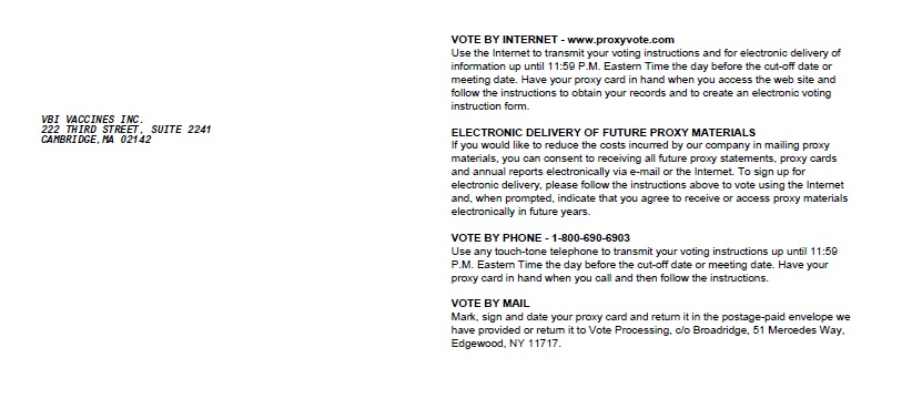 Vote by Mail. If you received a printed proxy card, you can vote by marking, dating and signing it, and returning it in the postage-paid envelope provided to VBI Vaccines Inc. c/o Broadridge, 51 Mercedes Way, Edgewood, NY 11717. Please promptly mail your proxy card to ensure that it is received prior to the closing of the polls at the Annual Meeting.