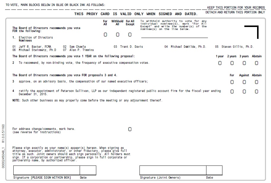 | (4) | Ratify the appointment of Peterson Sullivan LLP as our independent registered public accounting firm for the fiscal year ending December 31, 2015; and |