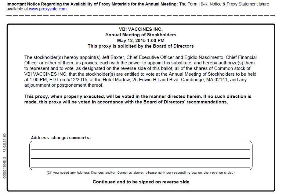 You are invited to attend the Annual Meeting of Stockholders of VBI Vaccines Inc. on May 12, 2015, which will be held at the Hotel Marlowe, 25 Edwin H Land Blvd, Cambridge, MA 02141 at 1 p.m., local time (the “Annual Meeting”). Enclosed with this letter are your Notice of Annual Meeting of Stockholders, Proxy Statement and Proxy voting card. The Proxy Statement included with this notice discusses each of our proposals to be considered at the Annual Meeting. Please review our annual report on Form 10-K for the year ended December 31, 2014 on our website at http://www.vbivaccines.com (under “Investors”).