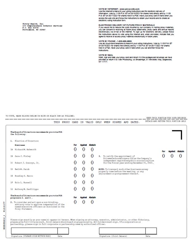 VOTE BY INTERNET - www.proxyvote.com Use the Internet to transmit your voting instructions and for electronic delivery of information. Vote by 11:59 P.M. ET on 05/19/2021 for shares held directly and by 11:59 P.M. ET on 05/17/2021 for shares held in a Plan. Have your proxy card in hand when you access the web site and follow the instructions to obtain your records and to create an electronic voting instruction form. Tivity Health, Inc. C/O Computershare Investor Services P.O. Box 43078 Providence, RI 02940 ELECTRONIC DELIVERY OF FUTURE PROXY MATERIALS If you would like to reduce the costs incurred by our company in mailing proxy materials, you can consent to receiving all future proxy statements, proxy cards and annual reports electronically via e-mail or the Internet. To sign up for electronic delivery, please follow the instructions above to vote using the Internet and, when prompted, indicate that you agree to receive or access proxy materials electronically in future years. VOTE BY PHONE - 1-800-690-6903 Use any touch-tone telephone to transmit your voting instructions. Vote by 11:59 P.M. ET on 05/19/2021 for shares held directly and by 11:59 P.M. ET on 05/17/2021 for shares held in a Plan. Have your proxy card in hand when you call and then follow the instructions. VOTE BY MAIL Mark, sign and date your proxy card and return it in the postage-paid envelope we have provided or return it to Vote Processing, c/o Broadridge, 51 Mercedes Way, Edgewood, NY 11717. TO VOTE, MARK BLOCKS BELOW IN BLUE OR BLACK INK AS FOLLOWS: KEEP THIS PORTION FOR YOUR RECORDS DETACH AND RETURN THIS PORTION ONLY THIS PROXY CARD IS VALID ONLY WHEN SIGNED AND DATED. The Board of Directors recommends you vote FOR the following: 1. Election of Directors Nominees Richard M. Ashworth For 0 0 0 0 0 0 0 For 0 Against 0 0 0 0 0 0 0 Against 0 Abstain 0 0 0 0 0 0 0 Abstain 0 1A For 0 Against 0 Abstain 0 1B Sara J. Finley 3. To ratify the appointment of PricewaterhouseCoopers LLP as the Company's independent registered public accounting firm for the fiscal year ending December 31, 2021. 1C Robert J. Greczyn, Jr. 1D Beth M. Jacob NOTE: To transact such other business as may properly come before the meeting, or any adjournment or postponement thereof. 1E Bradley S. Karro 1F Erin L. Russell 1G Anthony M. Sanfilippo The Board of Directors recommends you vote FOR proposals 2. and 3.. 2. To consider and act upon a non-binding, advisory vote to approve compensation of the named executive officers as disclosed in the Proxy Statement. Please sign exactly as your name(s) appear(s) hereon. When signing as attorney, executor, administrator, or other fiduciary, please give full title as such. Joint owners should each sign personally. All holders must sign. If a corporation or partnership, please sign in full corporate or partnership name by authorized officer. Signature [PLEASE SIGN WITHIN BOX] Date Signature (Joint Owners) Date 0000491812_1 R1.0.0.177