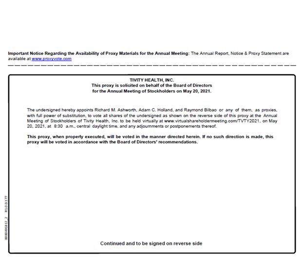 Important Notice Regarding the Availability of Proxy Materials for the Annual Meeting: The Annual Report, Notice & Proxy Statement are available at www.proxyvote.com TIVITY HEALTH, INC. This proxy is solicited on behalf of the Board of Directors for the Annual Meeting of Stockholders on May 20, 2021. The undersigned hereby appoints Richard M. Ashworth, Adam C. Holland, and Raymond Bilbao or any of them, as proxies, with full power of substitution, to vote all shares of the undersigned as shown on the reverse side of this proxy at the Annual Meeting of Stockholders of Tivity Health, Inc. to be held virtually at www.virtualshareholdermeeting.com/TVTY2021, on May 20, 2021, at 8:30 a.m., central daylight time, and any adjournments or postponements thereof. This proxy, when properly executed, will be voted in the manner directed herein. If no such direction is made, this proxy will be voted in accordance with the Board of Directors' recommendations. Continued and to be signed on reverse side 0000491812_2 R1.0.0.177