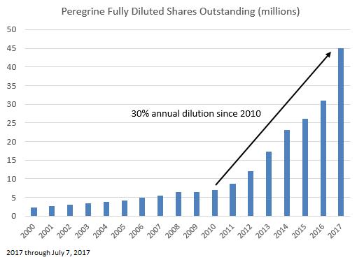 All clinical development activities should be immediately halted and the Company’s cost structure must be adjusted accordingly. In the last decade, we estimate that Peregrine has spent over $300 million cumulatively in research and development on clinical development activities, which are almost entirely related to bavituximab, a drug which has been unsuccessful in numerous clinical studies, most recently failing a Phase III SUNRISE trial in February 2016 for small cell lung cancer. It has shown similarly disappointing results for breast cancer, hepatitis C, and pancreatic cancer. Given bavituximab’s poor performance in clinical trials, it is questionable whether any further spending on its development is warranted at all; however, given Peregrine’s financial condition and the emergence of its contract development and manufacturing business, Avid Bioservices (“Avid”), squandering additional capital on further studies is objectively indefensible. The profligate spending on risky clinical development has caused Peregrine to continually resort to myopic and harmful financing solutions which have caused staggering stockholder dilution amounting to an astonishing 30% annually since fiscal year (“FY”) 2010. In its most recent Form 8-K filing on July 7, 2017, the Company revealed that the number of outstanding shares had risen to 315 million (now split-adjusted to 45 million shares), bringing the total dilution in FY 2017 alone (plus the subsequent period from April 30, 2017 through July 7, 2017) to an outrageous 45.6%. That management publicly laments its stock price and claims a focus on creating value for all stockholders while simultaneously diluting stockholders at such an extraordinary (and accelerating) rate shows a profound misunderstanding of governance, management and stockholder value.