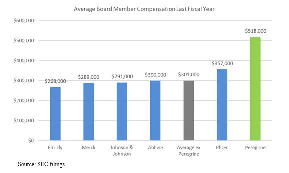 Despite their apparent lack of relevant experience, these directors somehow annually make hundreds of thousands of dollars more for their service on Peregrine’s Board than their counterparts who serve as directors of the hundred-billion dollar pharmaceutical firms noted above.