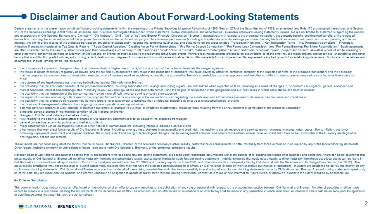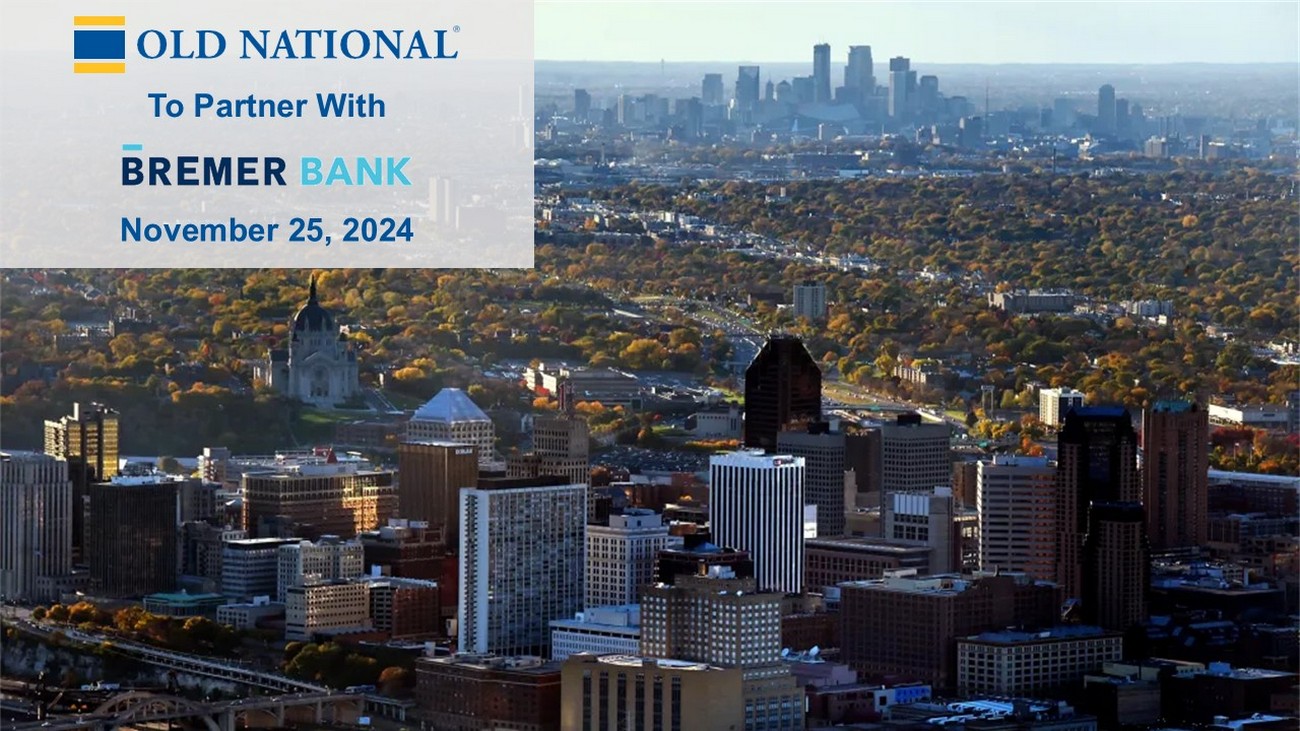 Disclaimer and Caution About Forward - Looking Statements 2 Certain statements in this presentation constitute “forward - looking statements” within the meaning of the Private Securities Lit igation Reform Act of 1995, Section 27A of the Securities Act of 1933, as amended, and Rule 175 promulgated thereunder, and S ect ion 21E of the Securities Exchange Act of 1934, as amended, and Rule 3b - 6 promulgated thereunder, which statements involve inherent risks and uncertainties. Examples of forward - looking statements include, but are not limited to, statements regarding the outlo ok and expectations of Old National Bancorp (the “Company”, “Old National”, “ONB”, “we” or “us”) and Bremer Financial Corporation (“Bremer”), respectively, with respect to the proposed transaction, the strategic benefits and financial benefits of the proposed transaction, including the expected impact of the proposed transactions on the combined company’s future financial performanc e ( including anticipated accretion to earnings per share, the tangible book value earn - back period and other operating and return metrics), the timing of the closing of the proposed transaction, the ability to successfully integrate the combined businesse s, and statements on the slides entitled “Transaction Highlights”, “Key Transaction Terms”, “Key Financial Assumptions,” “Financ ial ly Attractive Transaction Accelerating Top Quartile Returns,” “Rapid Capital Accretion,” “Creating Value For All Stakeholders,” “Pr o Forma Deposit Composition,” “Pro Forma Loan Composition,” and “Pro Forma Earnings Per Share Reconciliation.” Such statemen ts are often characterized by the use of qualified words (and their derivatives) such as “may,” “will,” “anticipate,” “could,” “ sho uld,” “would”, “believe,” “contemplate”, “expect,” “estimate”, “continue”, “plan”, “project” and “intend”, as well as words o f s imilar meaning or other statements concerning opinions or judgment of Old National or Bremer or their respective management about future events . F orward - looking statements are based on assumptions as of the time they are made and are subject to risks, uncertainties and othe r factors that are difficult to predict with regard to timing, extent, likelihood and degree of occurrence which could cause ac tua l results to differ materially from anticipated results, expressed or implied by such forward - looking statements. Such risks, u ncertainties and assumptions, include, among others, the following: the occurrence of any event, change or other circumstances that could give rise to the right of one or both of the parties to te rminate the merger agreement; the failure to obtain necessary regulatory approvals (and the risk that such approvals may result in the imposition of condit ion s that could adversely affect the combined company or the expected benefits of the proposed transaction) and the possibility that the proposed transaction does not close when expected or at all because required regulatory approvals, the approval by B rem er’s shareholders, or other approvals and the other conditions to closing are not received or satisfied on a timely basis or at all; the outcome of any legal proceedings that may be instituted against Old National or Bremer; the possibility that the anticipated benefits of the proposed transaction, including anticipated cost savings and strategic g ain s, are not realized when expected or at all, including as a result of changes in, or problems arising from, general economic and market conditions, interest and exchange rates, monetary policy, laws and regulations and their enforcement, and the degree o f c ompetition in the geographic and business areas in which Old National and Bremer operate; the possibility that the integration of the two companies may be more difficult, time - consuming or costly than expected; the impact of purchase accounting with respect to the proposed transaction, or any change in the assumptions used regarding t he assets acquired and liabilities assumed to determine their fair value and credit marks; the possibility that the proposed transaction may be more expensive or take longer to complete than anticipated, including as a result of unexpected factors or events; the diversion of management’s attention from ongoing business operations and opportunities; potential adverse reactions of Old National’s or Bremer’s customers or changes to business or employee relationships, includi ng those resulting from the announcement or completion of the proposed transaction; a material adverse change in the financial condition of Old National or Bremer; changes in Old National’s share price before closing; risks relating to the potential dilutive effect of shares of Old National’s common stock to be issued in the proposed transac tio n; general competitive, economic, political and market conditions; major catastrophes such as earthquakes, floods or other natural or human disasters, including infectious disease outbreaks; a nd other factors that may affect future results of Old National or Bremer, including, among others, changes in asset quality and cr edit risk; the inability to sustain revenue and earnings growth; changes in interest rates; deposit flows; inflation; custome r borrowing, repayment, investment and deposit practices; the impact, extent and timing of technological changes; capital manag eme nt activities; and other actions of the Federal Reserve Board, the Office of the Comptroller of the Currency and legislative and regulatory actions and reforms. These factors are not necessarily all of the factors that could cause Old National, Bremer, or the combined company’s actual res ults, performance or achievements to differ materially from those expressed in or implied by any of the forward - looking statemen ts. Other factors, including unknown or unpred