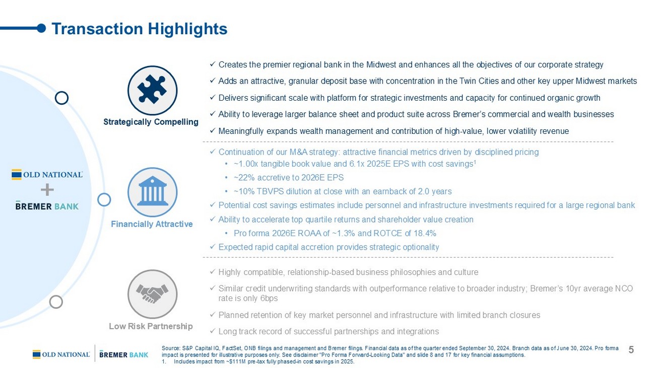 A Combination Creating the Premier Midwest Regional Bank Source: S&P Capital IQ, FactSet, ONB filings and management and Bremer filings . Financial data as of the quarter ended September 30, 2024 . 1. Reflects pro forma balances as of September 30, 2024 for illustrative purposes. 2. Pro forma impact is presented for illus tra tive purposes only. Inclusive of all purchase accounting adjustments, merger costs, CECL provision expense, sale of CRE loans and common equity offering. See disclaimer "Pro Forma Forward - Looking Da ta" and slides 8 and 17 for key financial assumptions. There can be no assurance that we will be able to find a prospective purchaser for the CRE loan sale concurrent with the merger or to sell the loans at a price or other terms acceptable to us. See appendix for Pro Forma EPS reconciliation. 3 . Reflects bank - level data. 4. Branch data as of June 30, 2024. 4 Compelling Partnership 1 Complementary Pro Forma Footprint 4 ~22% 2026E EPS Accretion 2.0 yrs TBVPS Earnback ~20% Internal Rate Of Return < 250% Pro Forma CRE / Total RBC At Close 3 ~1.3% Pro Forma 2026E ROAA 18.4% Pro Forma 2026E ROATCE 10.2% Pro Forma CET1 At Close ~84% Pro Forma Loans / Deposits At Close Gross Loans $46B Deposits $54B Wealth AUM $39B Total Assets $70B ND MN SD IA MO IL TN KY OH IN MI WI ONB Disciplined Approach Focused on Maximizing Shareholder Value 2 (289) (70) Pro Forma Scale
