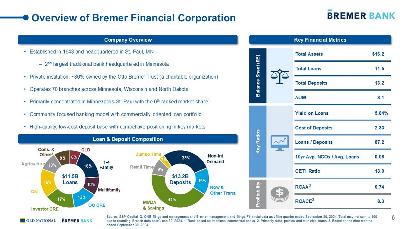 x Creates the premier regional bank in the Midwest and enhances all the objectives of our corporate strategy x Adds an attractive, granular deposit base with concentration in the Twin Cities and other key upper Midwest markets x Delivers significant scale with platform for strategic investments and capacity for continued organic growth x Ability to leverage larger balance sheet and product suite across Bremer’s commercial and wealth businesses x Meaningfully expands wealth management and contribution of high - value, lower volatility revenue x Continuation of our M&A strategy: attractive financial metrics driven by disciplined pricing • ~1.00x tangible book value and 6.1x 2025E EPS with cost savings 1 • ~22% accretive to 2026E EPS • ~10% TBVPS dilution at close with an earnback of 2.0 years x Potential cost savings estimates include personnel and infrastructure investments required for a large regional bank x Ability to accelerate top quartile returns and shareholder value creation • Pro forma 2026E ROAA of ~1.3% and ROTCE of 18.4% x Expected rapid capital accretion provides strategic optionality x Highly compatible, relationship - based business philosophies and culture x Similar credit underwriting standards with outperformance relative to broader industry; Bremer’s 10yr average NCO rate is only 6bps x Planned retention of key market personnel and infrastructure with limited branch closures x Long track record of successful partnerships and integrations Transaction Highlights Strategically Compelling 5 Financially Attractive Low Risk Partnership Source: S&P Capital IQ, FactSet, ONB filings and management and Bremer filings . Financial data as of the quarter ended September 30, 2024 . Branch data as of June 30, 2024. Pro forma impact is presented for illustrative purposes only. See disclaimer "Pro Forma Forward - Looking Data" and slide 8 and 17 for key f inancial assumptions. 1. Includes impact from ~$111M pre - tax fully phased - in cost savings in 2025.