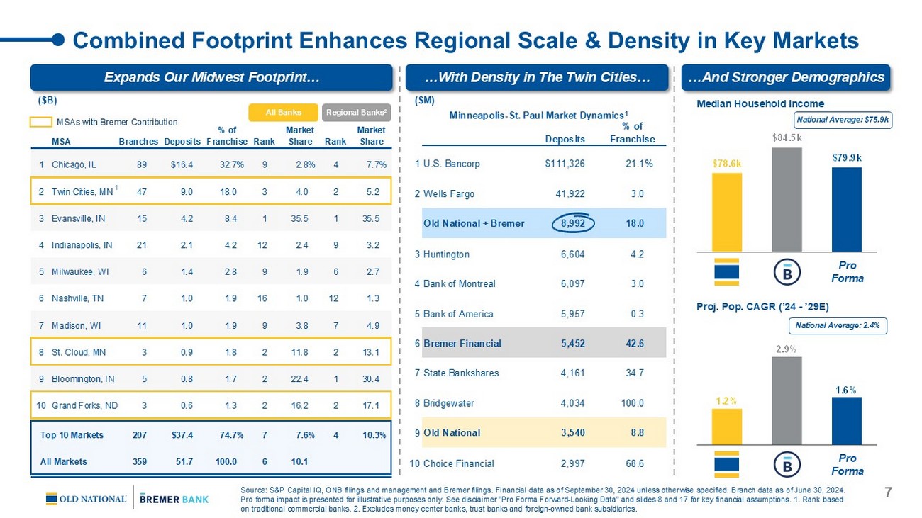 28% 15% 44% 9% 3% 6% 18% 10% 13% 17% 16% 10% 9% Loan & Deposit Composition O O CRE Investor CRE $11.5B Loans $13.2B Deposits CLD Multifamily C&I 1 - 4 Family Cons. & Other 2 Agriculture Retail Time Jumbo Time Non - Int Demand Now & Other Trans. MMDA & Savings • Established in 1943 and headquartered in St. Paul, MN – 2 nd largest traditional bank headquartered in Minnesota • Private institution, ~86% owned by the Otto Bremer Trust (a charitable organization) • Operates 70 branches across Minnesota, Wisconsin and North Dakota • Primarily concentrated in Minneapolis - St. Paul with the 6 th ranked market share 1 • Community - focused banking model with commercially - oriented loan portfolio • High - quality, low - cost deposit base with competitive positioning in key markets Overview of Bremer Financial Corporation 6 Source: S&P Capital IQ, ONB filings and management and Bremer management and filings . Financial data as of the quarter ended September 30, 2024. Total may not sum to 100 due to rounding. Branch data as of June 30, 2024. 1. Rank based on traditional commercial banks. 2. Primarily state, politica l a nd municipal loans. 3. Based on the nine months ended September 30, 2024. Key Ratios Balance Sheet ($B) Profitability Company Overview Key Financial Metrics 3 3