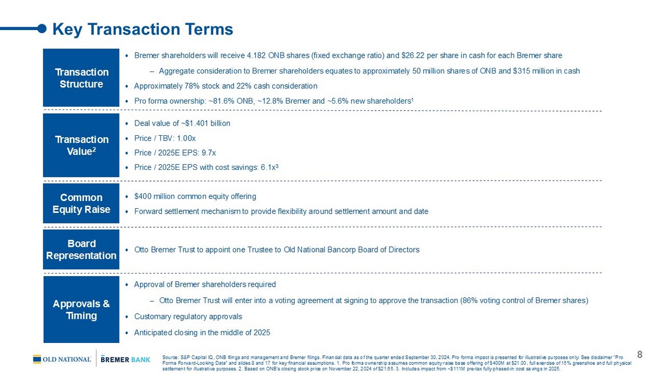 Proj . Pop. CAGR (’24 - ’29E) Minneapolis-St. Paul Market Dynamics % of Deposits Franchise 1U.S. Bancorp $111,326 21.1% 2Wells Fargo 41,922 3.0 Old National + Bremer Old National + Bremer 8,992 18.0 3Huntington 6,604 4.2 4Bank of Montreal 6,097 3.0 5Bank of America 5,957 0.3 6 Bremer Financial 5,452 42.6 7State Bankshares 4,161 34.7 8Bridgewater 4,034 100.0 9 Old National 3,540 8.8 10Choice Financial 2,997 68.6 % of Market Market MSA Branches Deposits Franchise Rank Share Rank Share 1 Chicago, IL 89 $16.4 32.7% 9 2.8% 4 7.7% 2 Twin Cities, MN 47 9.0 18.0 3 4.0 2 5.2 3 Evansville, IN 15 4.2 8.4 1 35.5 1 35.5 4 Indianapolis, IN 21 2.1 4.2 12 2.4 9 3.2 5 Milwaukee, WI 6 1.4 2.8 9 1.9 6 2.7 6 Nashville, TN 7 1.0 1.9 16 1.0 12 1.3 7 Madison, WI 11 1.0 1.9 9 3.8 7 4.9 8 St. Cloud, MN 3 0.9 1.8 2 11.8 2 13.1 9 Bloomington, IN 5 0.8 1.7 2 22.4 1 30.4 10 Grand Forks, ND 3 0.6 1.3 2 16.2 2 17.1 Top 10 Markets 207 $37.4 74.7% 7 7.6% 4 10.3% All Markets 359 51.7 100.0 6 10.1 Pro Forma Combined Footprint Enhances Regional Scale & Density in Key Markets 7 Source: S&P Capital IQ, ONB filings and management and Bremer filings. Financial data as of September 30, 2024 unless otherwi se specified. Branch data as of June 30, 2024. Pro forma impact is presented for illustrative purposes only. See disclaimer "Pro Forma Forward - Looking Data" and slides 8 and 17 for key financial assumptions. 1. Rank based on traditional commercial banks. 2. Excludes money center banks, trust banks and foreign - owned bank subsidiaries. Expands Our Midwest Footprint… …With Density in The Twin Cities… 1 7 MSAs with Bremer Contribution All Banks Regional Banks 2 …And Stronger Demographics Pro Forma National Average: 2.4% Median Household Income National Average: $75.9k 1 ($B) ($M)